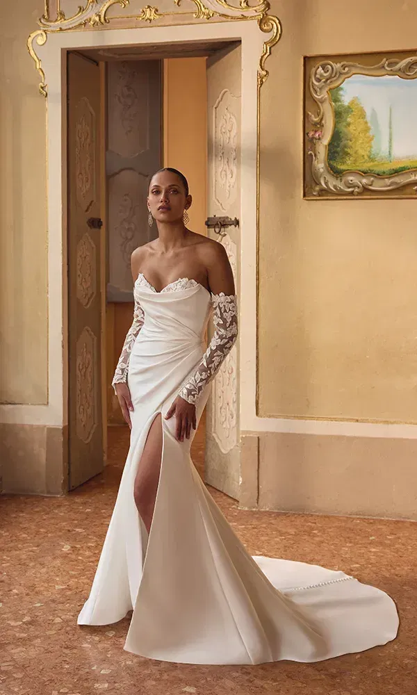 Dieses trägerlose, drapierte Brautkleid mit abnehmbaren Spitzenärmeln heißt Kendall und verströmt zeitlosen Charme. Ein eleganter Look mit feinem Faltenwurf aus der L’Amore-Kollektion von Justin Alexander.