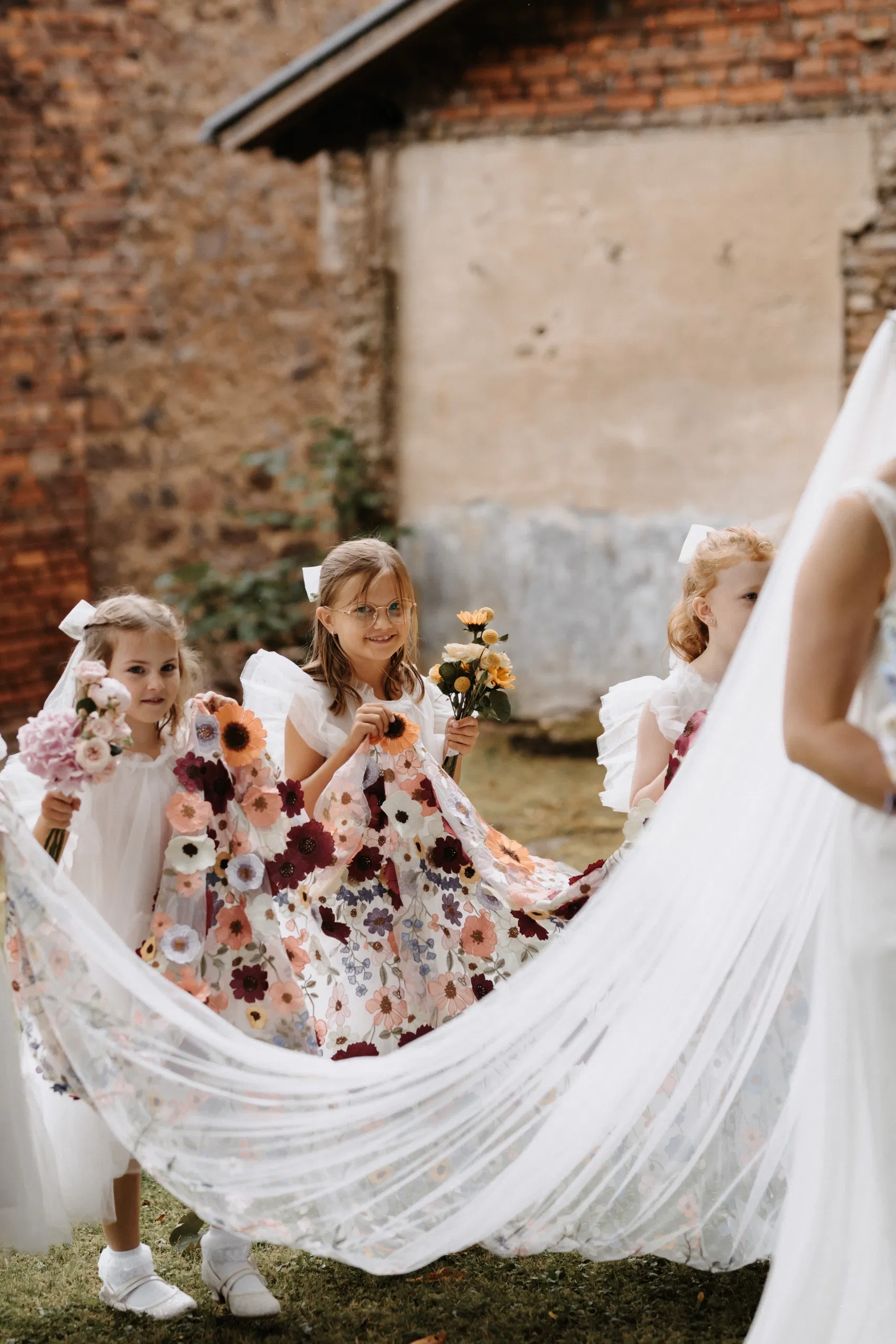 Kaum etwas ist niedlicher, als wenn Kinder die Schleppe des Brautkleids tragen. Sie bleibt dadurch sauber und die kleinen Helfer fühlen sich wie ganz große Stars.