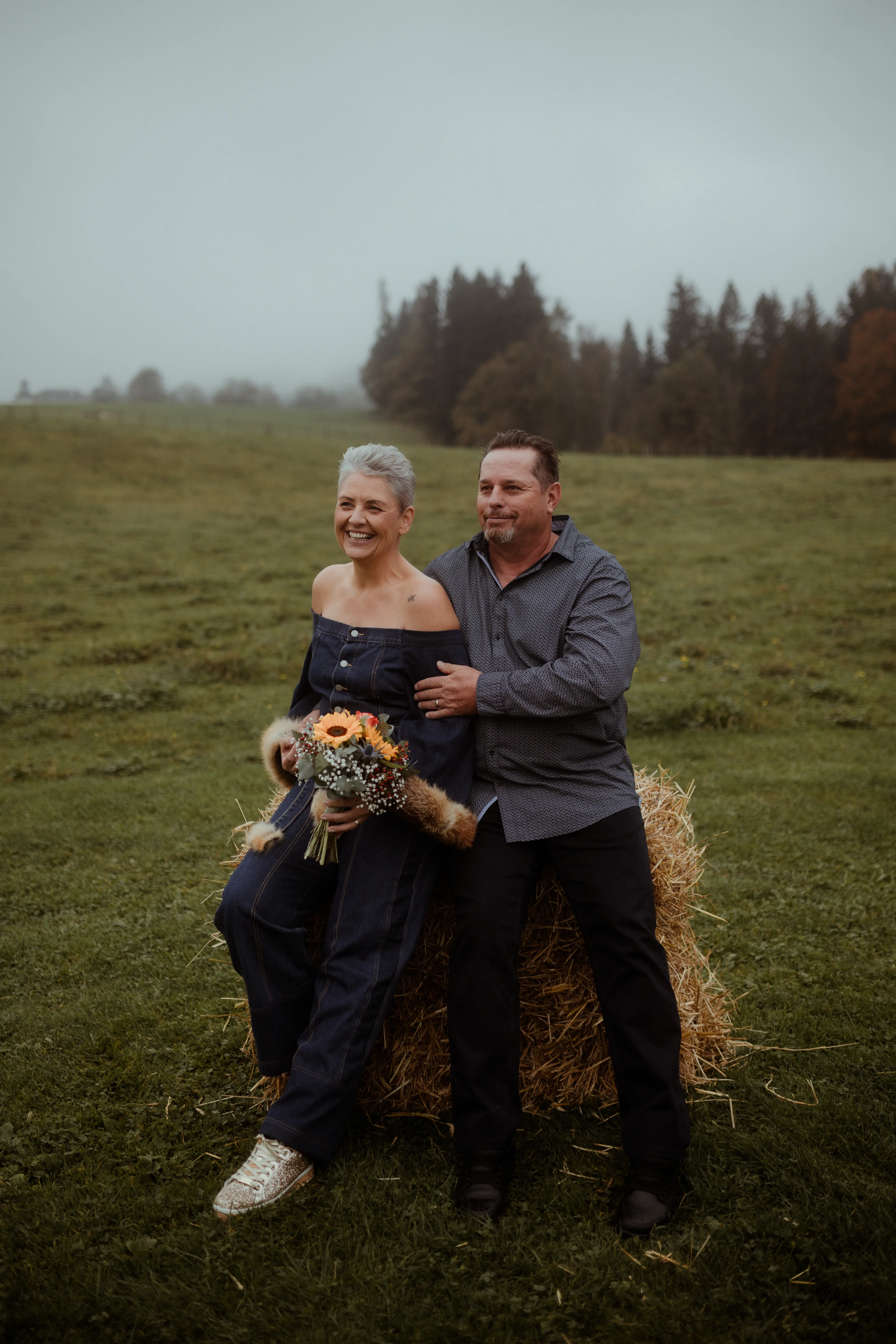 Bei der Hochzeit selbst gab es keine klassischen Hochzeitsregeln und -bräuche. So erlebten die Gäste eine Überraschung nach der anderen. Statt des traditionellen Ablaufs gab es zuerst ein köstliches regionales Buffet mit regionalen Schmankerln, gefolgt von der entspannten Zeremonie, in der sich das Brautpaar das Jawort gab, während die Gäste auf den Strohballen Platz nahmen. Thomas wurde von seiner Tochter Anna zum Altar gebracht, danach folgte Alexandra mit ihrem Sohn Lukas. Ein besonderer Moment: Der gemeinsame Familienhund Bruno, eine Französische Bulldogge, brauchte den Brautleuten die Ringe – natürlich stilecht mit einem Jeans-Halsband samt Fliege.