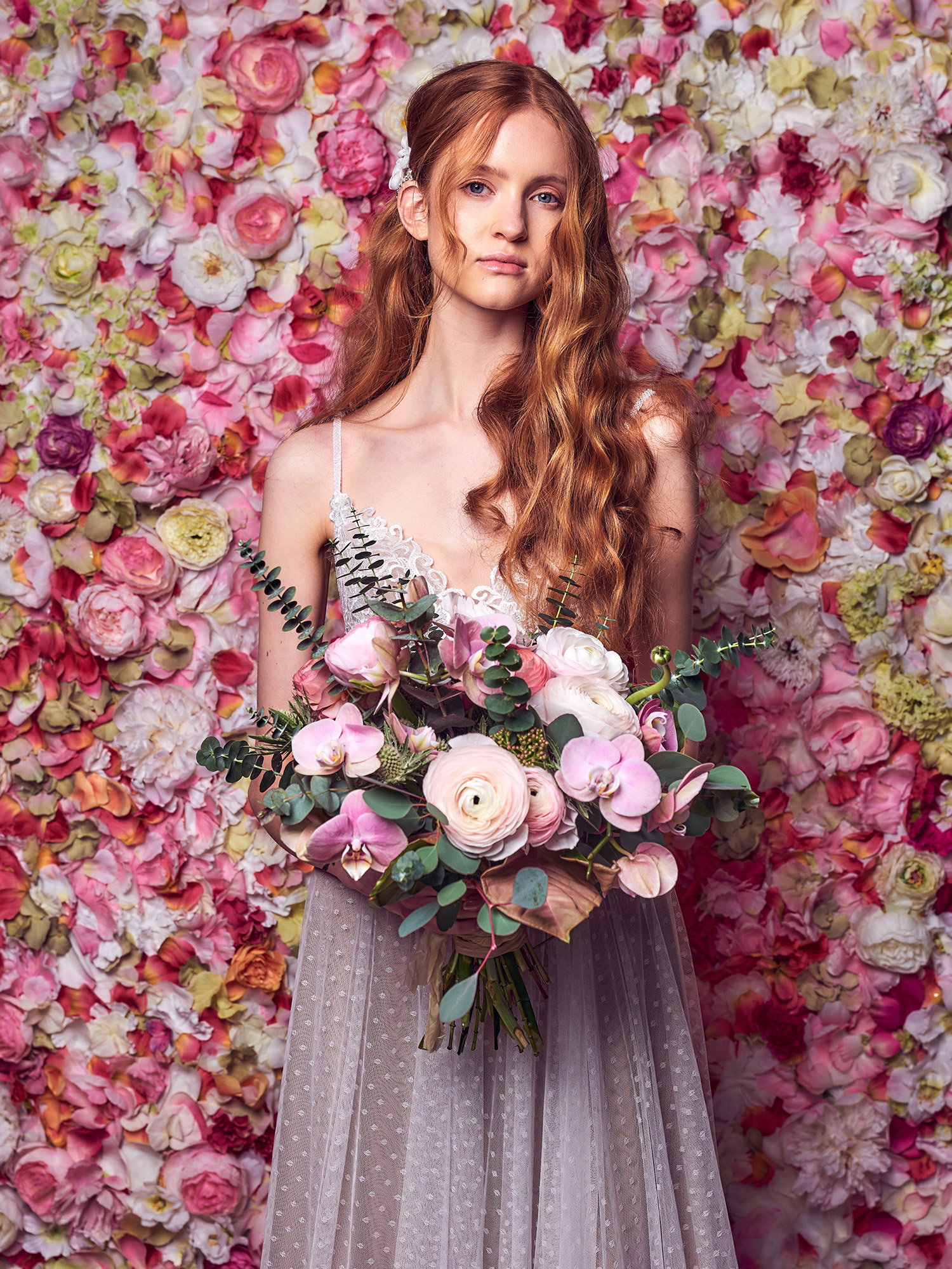 Vor einer atemberaubenden Wand aus unzähligen Ranunkeln kommt die Braut besonders gut zur Geltung. Sie strahlt in einem traumhaften Kleid mit funkelndem Rockteil und wird so zur Hauptdarstellerin vor einer perfekten, blumigen Kulisse.