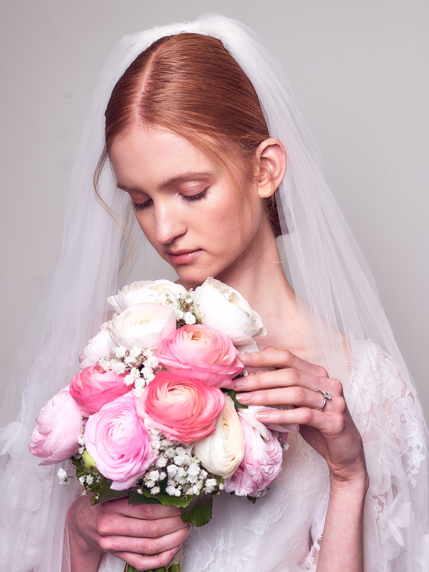 Zarte Ranunkeln und Schleierkraut schmiegen sich wie ein bezaubernder Rahmen um das Gesicht der Braut. Dieser außergewöhnliche Look kreiert einen floralen Schleier, der pure Poesie und Romantik verströmt – ein wahrhaft märchenhafter Auftritt.