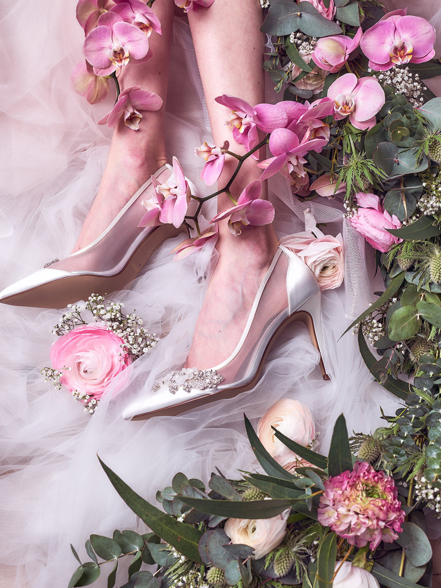 Zwischen zarten Ranunkeln und duftendem Eukalyptus kommen diese eleganten Satin-Heels besonders zur Geltung. Die Schuhe sind der perfekte Mix aus funkelndem Glamour und zarter Romantik und setzen unter dem Kleid einen brillanten Akzent.