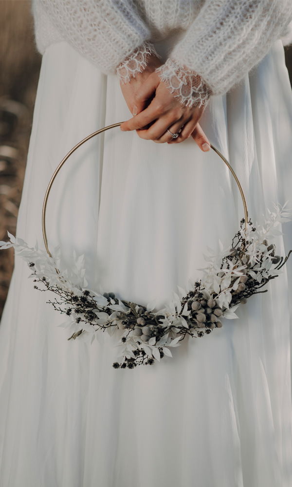 Wir sind schwerverliebt in diese coole Art von Brautstrauß: den Flower Loop. Der Metallring kann in unterschiedlichen Größen und mit frischen oder getrockneten Blumen gestaltet sein. Du als Braut kannst ihn tragen oder ihr dekoriert mit zweien eure Braut- und Bräutigam-Stühle in der Zeremonie oder an der Festtafel.