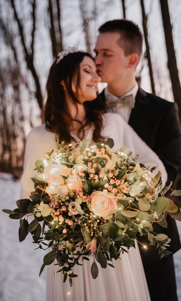 Dieser Brautstrauß ist perfekt für die Abenddämmerung oder eure Abendhochzeit, denn zwischen das üppige Grün und die zarten pfirsich- und cremefarbenen Blüten ist eine Lichterkette eingewebt, die ihm seinen besonderen Glanz verleiht. Damit entstehen besonders schöne Fotos mit einer ganz speziellen Atmosphäre.