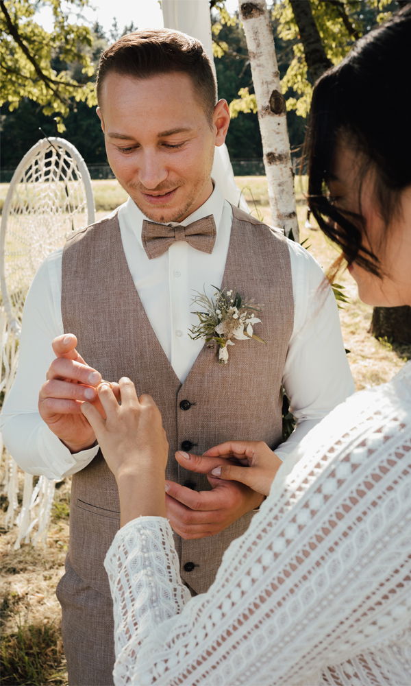 Erdtöne wie Beige, Hellbraun, zartes Grün und Grau sind die perfekte Wahl. Diese Farben harmonieren wunderbar mit der Naturkulisse vieler Boho-Hochzeiten und sorgen für eine entspannte, natürliche Ausstrahlung. Durch die Wahl dieser sanften, ruhigen Farben passt sich der Look des Bräutigams optimal dem rustikalen und natürlichen Thema des Tages an. Das Ergebnis: ein stilvoller Look, der perfekt mit der Umgebung harmoniert – ideal für eine Boho-Hochzeit.
