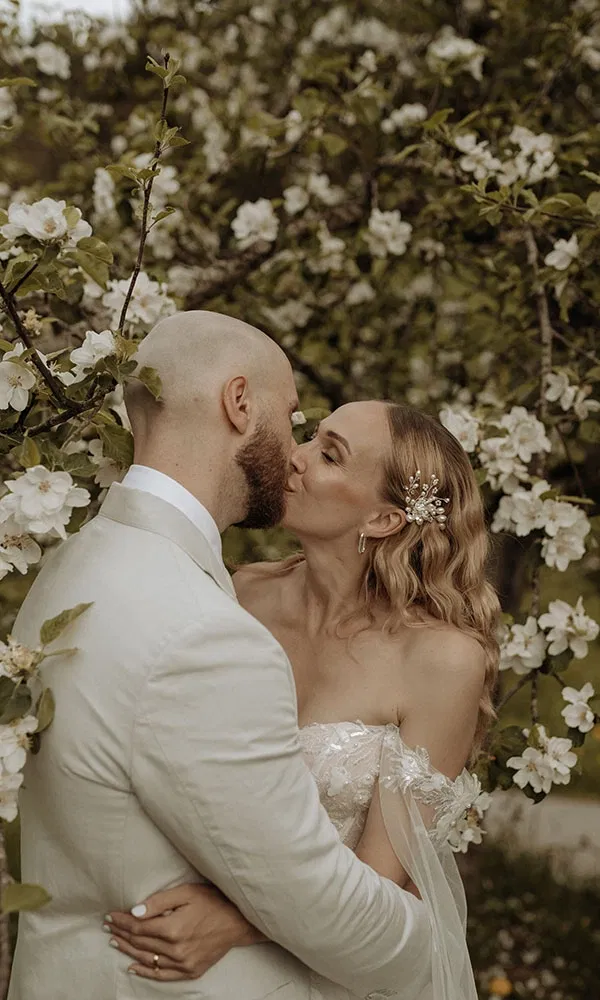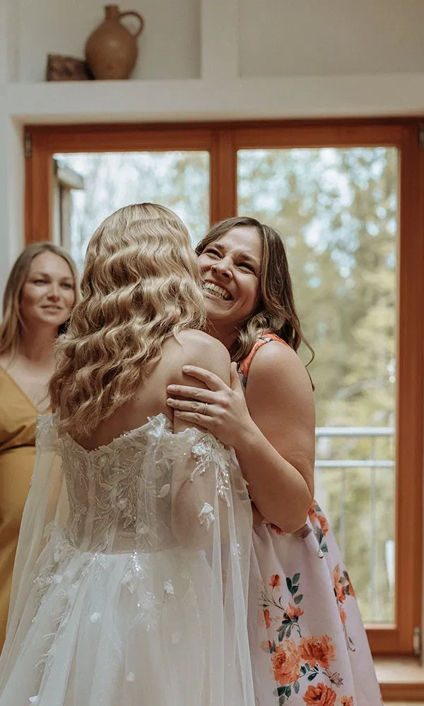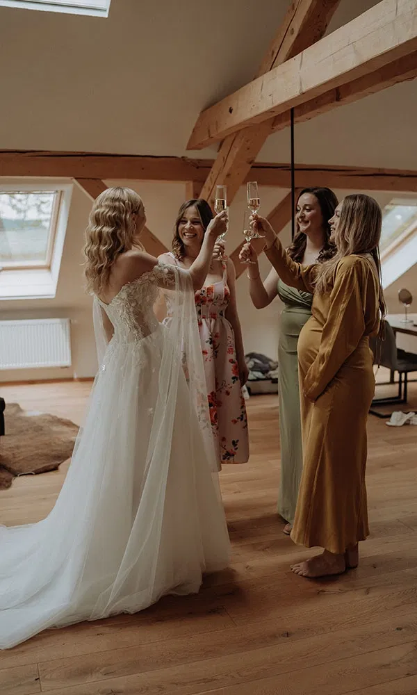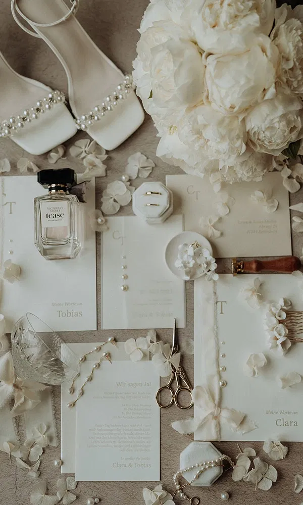 Für Clara-Luise und Tobias war der Einzug zur Trauung der wohl berührendste Moment ihres Hochzeitstages. Während die Band „Book of Love“ spielte, wartete Tobias mit den gemeinsamen Zwillingen am Traubogen, als Clara von ihrem Vater zum Altar geführt wurde – ein Augenblick voller Emotionen. Dann stand das Paar allein vor dem Traubogen, als plötzlich Claras Bruder aufstand und die Traurede begann. Dass er die freie Trauung durchführte, war eine liebevolle Überraschung, die niemanden unberührt ließ. Kein Auge blieb trocken und für Clara und Tobias war es genau so, wie es sein sollte: persönlich, authentisch und unvergesslich.