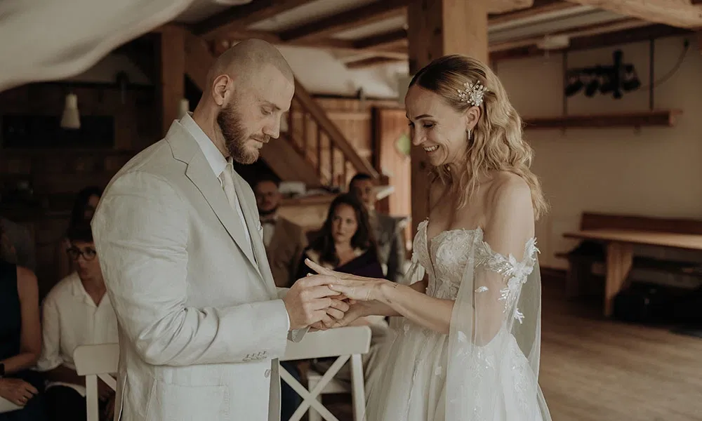 Ihre Suche nach der perfekten Hochzeits-Location führte sie ins Allgäu. Wichtig war ihnen, dass sie dort das ganze Wochenende mit ihren Liebsten verbringen konnten. „Mit dem Berghof Riesen haben wir den perfekten Ort gefunden“, sagt Clara-Luise. Auch ihre weiteren Dienstleister fanden sie in der Umgebung – ganz regional und stimmig zum Konzept. Ihre Liebe feierte das Paar mit 30 Gästen plus Kindern.