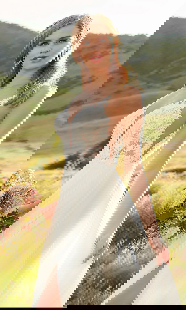 Erfüllen Sie sich Ihren Boho-Traum mit diesem zauberhaften Brautkleid! Der cleane V-Ausschnitt teilt sich elegant auf dem Rücken. Dem üppigen Capri-Chiffon-Rock folgt eine glamouröse Schleppe, die sich auch bei einem Gang über Sand weich und leicht anfühlt. Foto: Essense of Australia D3111
