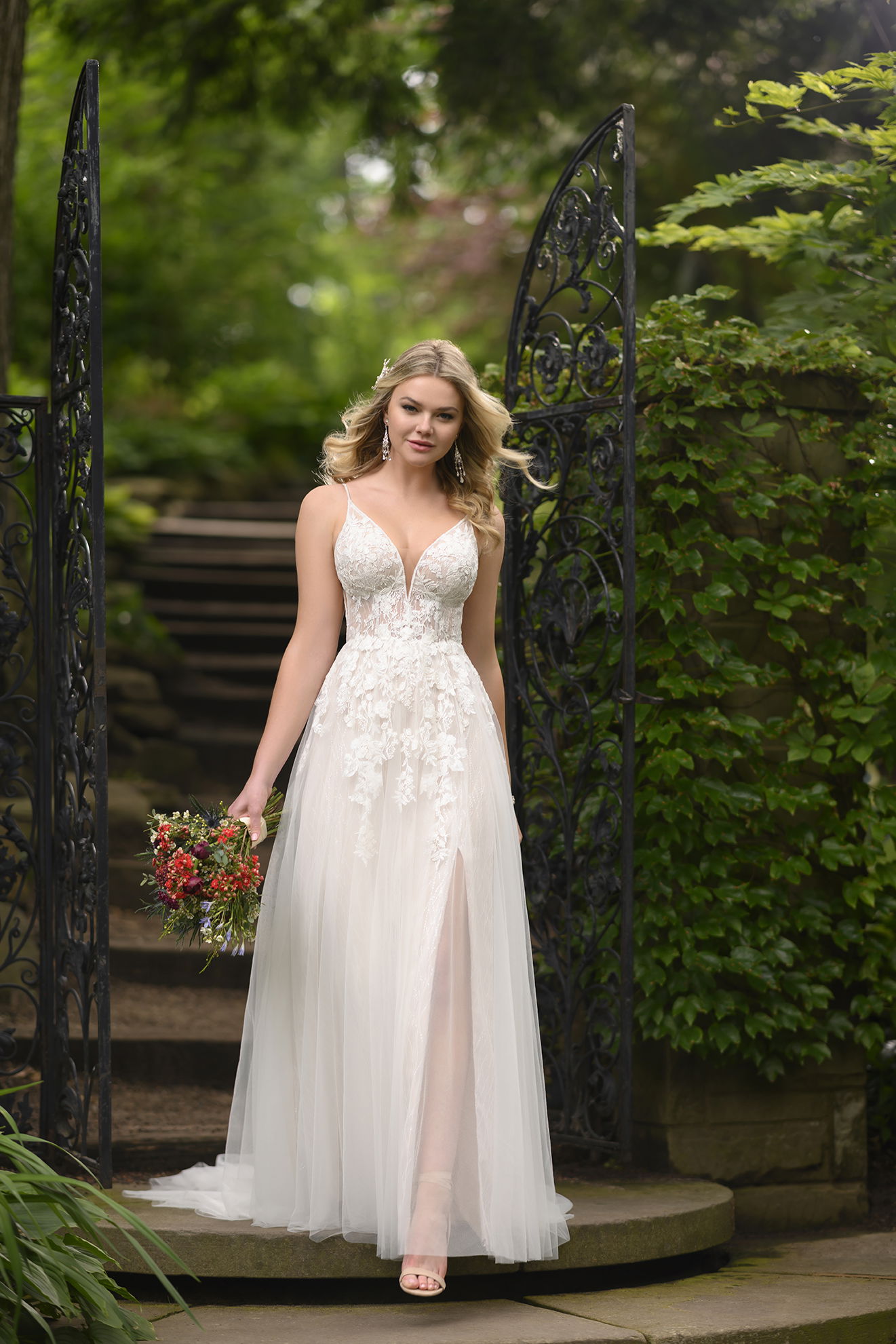 Atemberaubend und luftig-leicht sorgt dieses Traumkleid für einen absolut strandtauglichen Hochzeitslook. Der tiefe V-Ausschnitt und die verspielten Seiten-Ausschnitte sind klassisch und feminin. Das schlichte Mieder und die dünnen Träger verleihen dem Modell genau das richtige Maß an Sexyness. Zart über die Taille und auf den Tüllrock fallende Blumen erwecken das von der Natur inspirierte Design zum Leben. Foto: Essense of Australia Style D2840