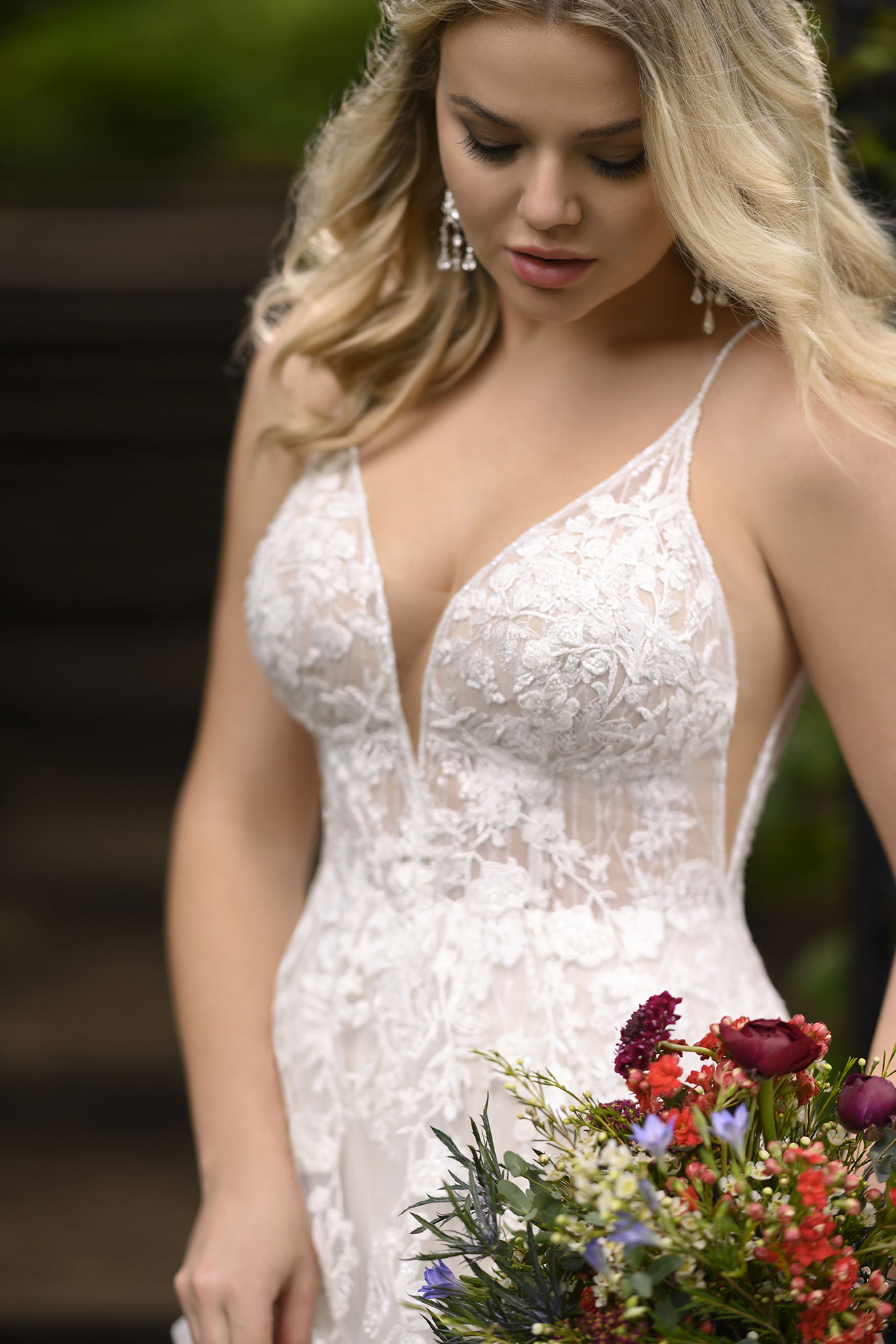 Nicht zuletzt schenkt uns Martina Liana ein auffälliges, einzigartiges Design. Der modernen und raffinierten Braut steht die Mischung aus französischer Spitze und Pariser Seidenchiffon perfekt. Das durchsichtige Mieder wird von üppiger, floraler Spitze umhüllt, die entlang der Träger und der seitlichen Ausschnitte ein organisches Finish bildet. Ein wundervoller Eyecatcher ist der elegante Schlitz im Rock. Foto: Martina Liana Style 1150
