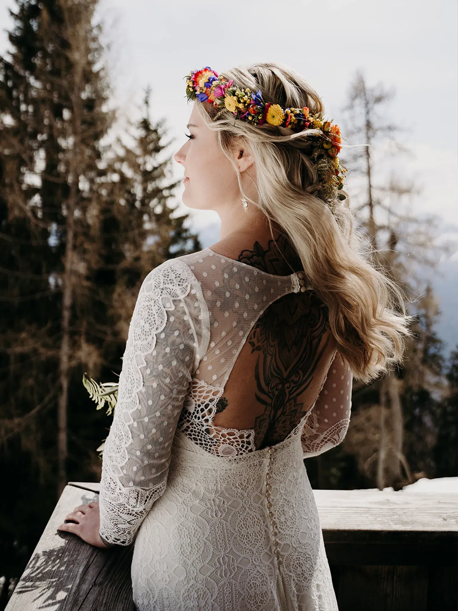 Moderne Brautkleider mit langen Spitzenärmeln oder Kleider mit elegantem Illusion-Ausschnitt sind ideal für eine Winterhochzeit. Wichtige Accessoires, die nicht fehlen dürfen, sind wärmende Extras wie edle Handschuhe, eine flauschige Jacke oder eine stilvolle Stola. Bedenkt auch den praktischen Aspekt: Ein zusätzliches Paar wetterfeste Schuhe kann helfen, trockenen Fußes durch den Schnee zu schreiten.
