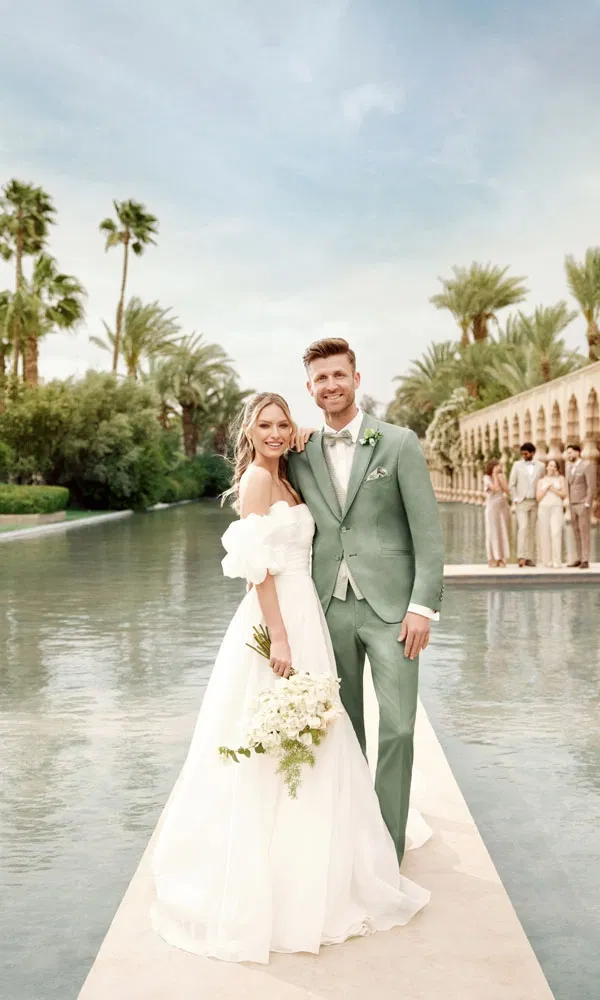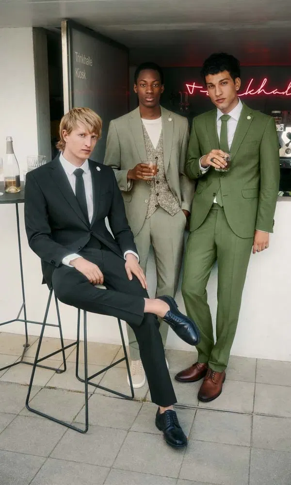 Grüntöne haben sich in den letzten Jahren zu echten Favoriten entwickelt. Von Salbei über Olive bis hin zu sattem Moosgrün wirken diese Nuancen ruhig, stilvoll und gleichzeitig außergewöhnlich. Besonders bei Outdoor-Hochzeiten oder Feiern mit natürlichem Konzept fügt sich Grün harmonisch ins Gesamtbild ein. In Kombination mit hellen Hemden, Ton-in-Ton-Westen oder warmen Brauntönen entsteht ein Look, der modern wirkt und dennoch zeitlos bleibt.