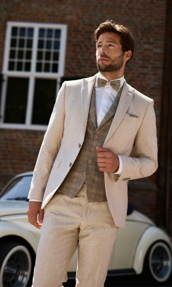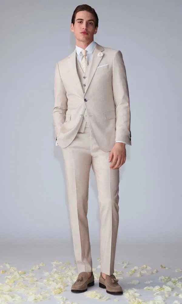 Helle Naturtöne wie Beige, Sand oder Creme stehen für Leichtigkeit und sommerliche Eleganz. Sie eignen sich perfekt für Hochzeiten im Freien, Destination Weddings oder Feiern mit mediterranem Flair. Diese Farben wirken weniger formell, ohne an Stil zu verlieren, und lassen sich wunderbar mit strukturierten Stoffen, Westen oder dezenten Mustern kombinieren. Das Ergebnis: ein entspannter, aber sehr gepflegter Bräutigam-Look.