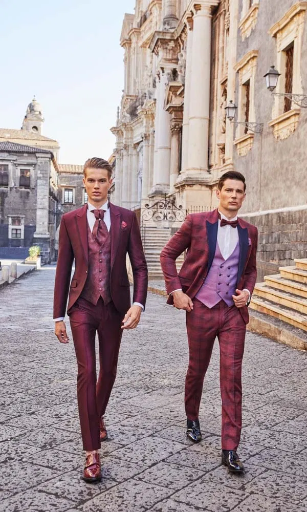 Bordeauxrot steht für Eleganz, Tiefe und einen Hauch Dramatik. Die satte Farbe wirkt besonders edel und verleiht dem Bräutigam eine starke Präsenz, ohne laut zu sein. Ob als kompletter Anzug oder gezielt eingesetzt bei Sakko, Weste oder Accessoires – Bordeauxrot lässt sich vielseitig interpretieren. Besonders in Kombination mit gedeckten Farben, feinen Stoffstrukturen und klassischen Schnitten entsteht ein Look, der modern ist und gleichzeitig zeitlos wirkt. Ideal für Herbst- und Winterhochzeiten, aber auch für alle, die bewusst Farbe zeigen möchten.