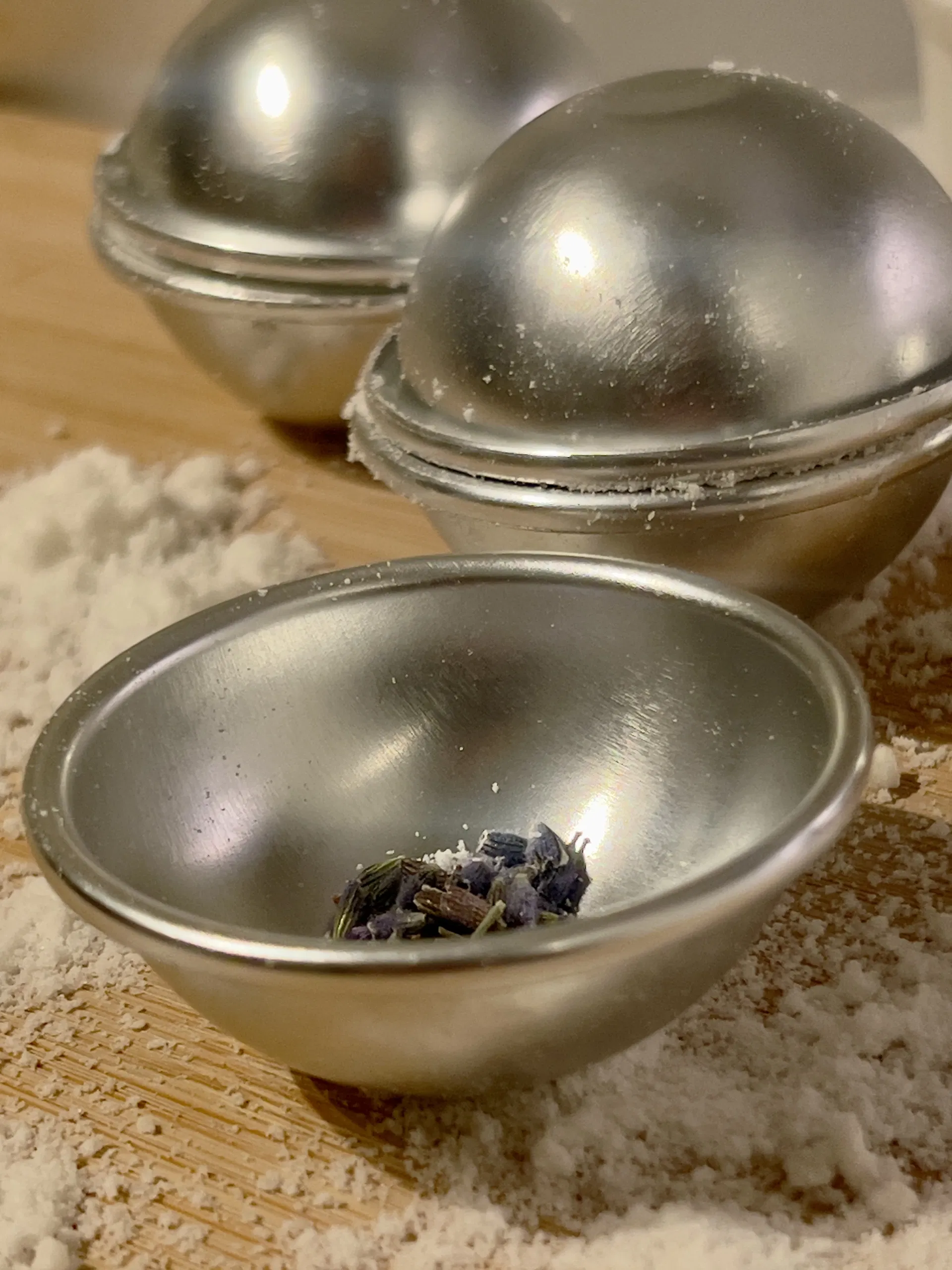 5. Ist die Masse gleichmäßig vermengt? Dann kannst du sie jetzt in Form bringen! Nimm deine Badekugelformen, gib zunächst ein paar getrocknete Lavendelblüten hinein und fülle anschließend beide Hälften gut auf.