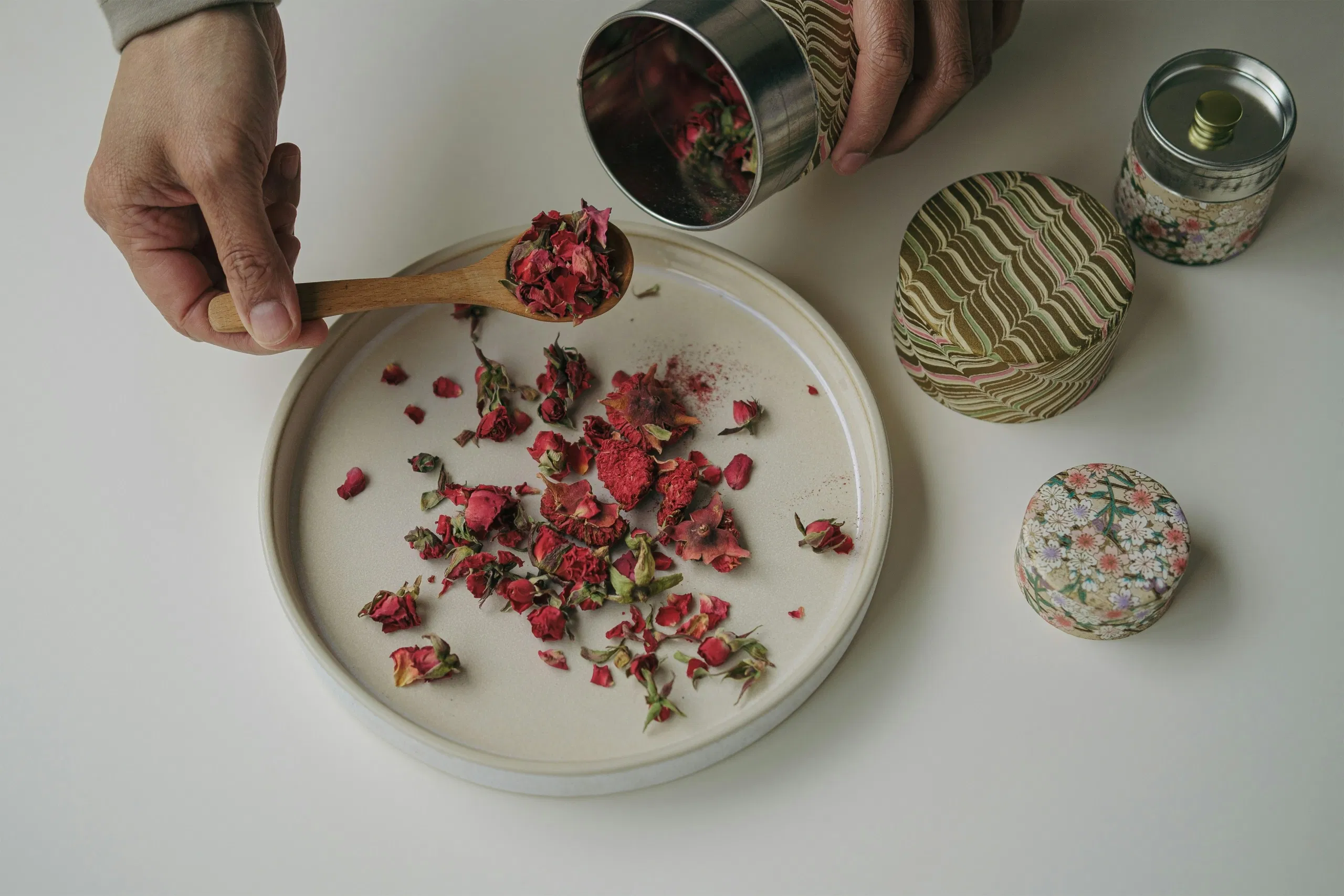 4. In kleinen Tropfen die Masse Schritt-für-Schritt mit Lebensmittelfarbe einfärben. Optional kannst Du ein paar getrocknete Lavendel- oder Rosenblüten hinzugeben.