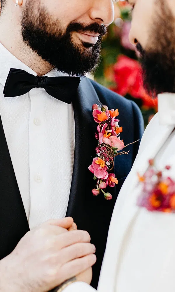 Die Boutonnière bringt mit kräftigen Pink- und Orangetönen einen ausdrucksstarken Farbtupfer an den Smoking. Feine Blüten und Zweige verleihen dem Ensemble eine moderne und individuelle Ausstrahlung.