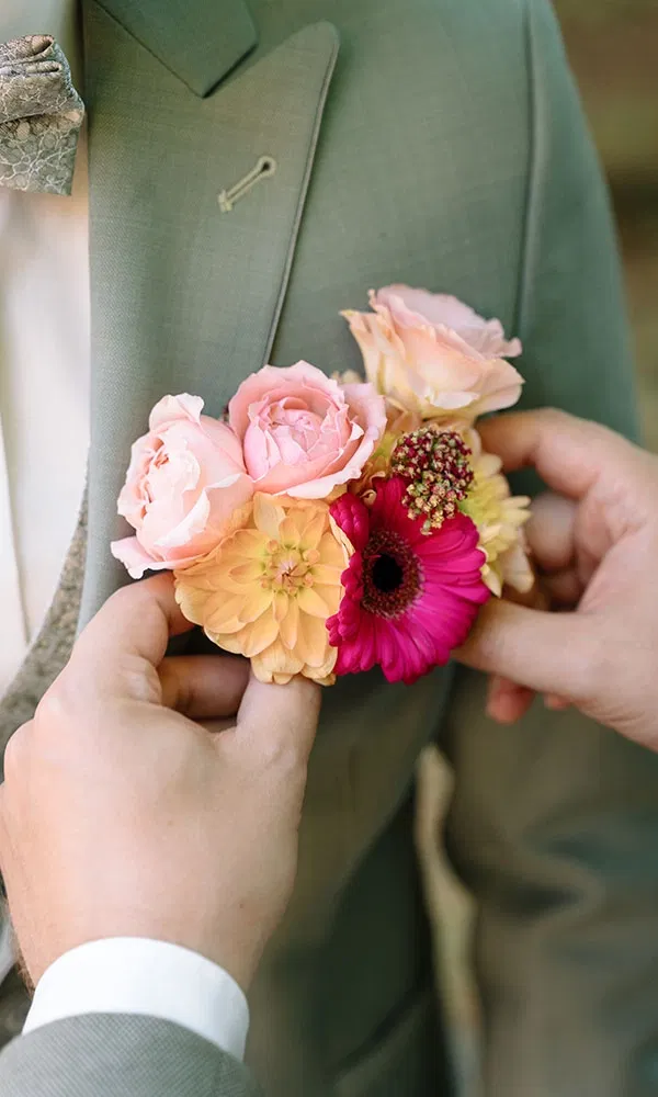 Die Farbwahl und der Stil der Corsage werden genau auf den Brautstrauß abgestimmt. Diese Harmonie zwischen den Accessoires der Braut und des Bräutigams sorgt für ein rundes und stilvolles Gesamtbild.