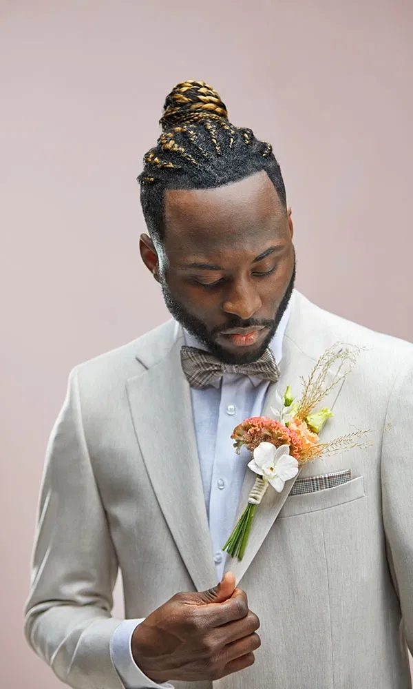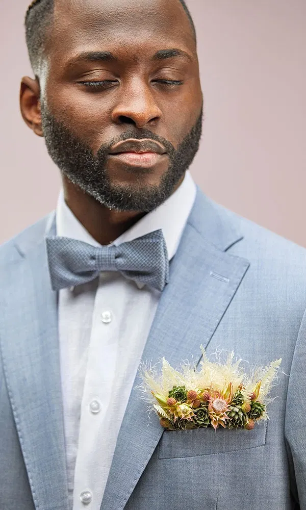Diese besondere Boutonnière fällt durch ihre kunstvolle Kombination aus getrockneten Blüten, filigranen Gräsern und strukturierten Elementen sofort ins Auge. Die warmen Creme- und Goldtöne harmonieren wunderbar mit dem hellblauen Anzug und verleihen dem Gesamtlook eine moderne, stilvolle Note.