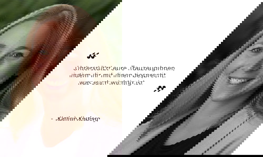 „Ist es dem Hochzeitspaar wichtig? Dann ja! JGA organisieren, Kleid aussuchen, Rede halten – die To-Do-Liste der TrauzeugInnen ist lang. Dazu kommt ihr eigener Erwartungsdruck, für das Hochzeitspaar alles perfekt machen zu wollen. Unterstützt eure TrauzeugInnen, indem ihr mit ihnen besprecht, was euch wichtig ist. Steht „Gemeinsam feiern bis zum bitteren Ende“ auf der Prioritätenliste, sollten eure TrauzeugInnen versuchen, euch diesen Wunsch zu erfüllen.” – Kathrin Kesberg