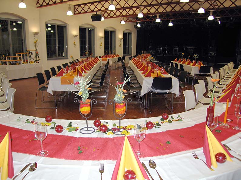 Materialien und Texturen stehen bei diesem Stil im Fokus. Massive Holz- oder Metalltische werden mit samtenen Tischläufern, goldenen oder kupferfarbenen Kerzenständern und Kristallgläsern kombiniert, die das Licht wunderschön reflektieren. Üppige Blumenarrangements in tiefen Rot-, Violett-, Smaragd-, Weiß- oder Blushtönen bilden einen spannenden Kontrast zur industriellen Kulisse. Lichterketten, Kerzenleuchter oder moderne Kronleuchter verstärken den dramatischen Effekt und sorgen für Wärme.