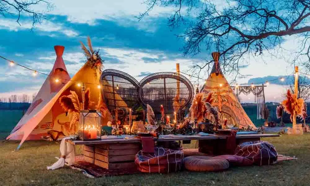 Kreativität steht bei der Gestaltung im Mittelpunkt. Bunte Kissen, Vintage-Teppiche, Rattan-Poufs und Holzpaletten formen einladende Sitzbereiche zum Entspannen. Lange Tafeln mit locker gebundenen Blumenarrangements im wilden, natürlichen Stil unterstreichen den freien Charakter dieses Konzepts. Foodtrucks, Cocktailbars und Polaroid-Ecken fügen sich perfekt ein und sorgen für echtes Festivalfeeling – ganz entspannt und ungezwungen.