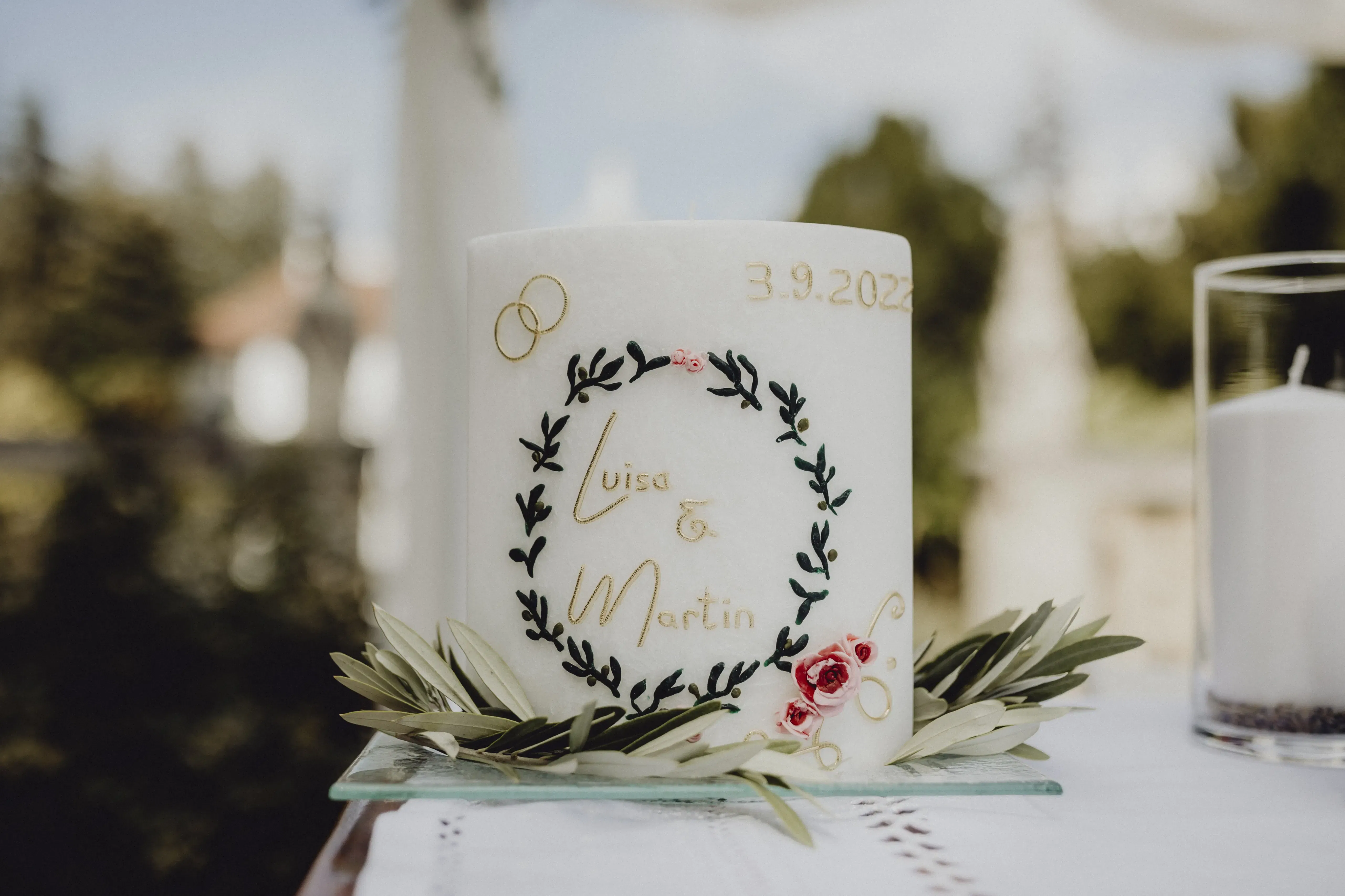 Die Trauung war wunderschön und Festdetails wie die Hochzeitskerze, die von Martins Schwester gestaltet wurde, machten die Zeremonie sehr persönlich. Danach ging es zur Agape in den Vorgarten des Schlosses. Während die Gäste Sekt und Flying Fingerfood genossen und mit diversen Aufgabenkärtchen, die Martin zuvor verteilt hatte, beschäftigt waren, brauste das Paar mit seiner Fotografin im Golf Cart zu den unterschiedlichsten Orten im Schlosspark, um bleibende Erinnerungen zu schaffen. „Sophie hat während des Paar-Shootings für eine sehr lustige, entspannte Stimmung gesorgt und uns immer wieder zum Lachen gebracht“, erzählt Luisa.