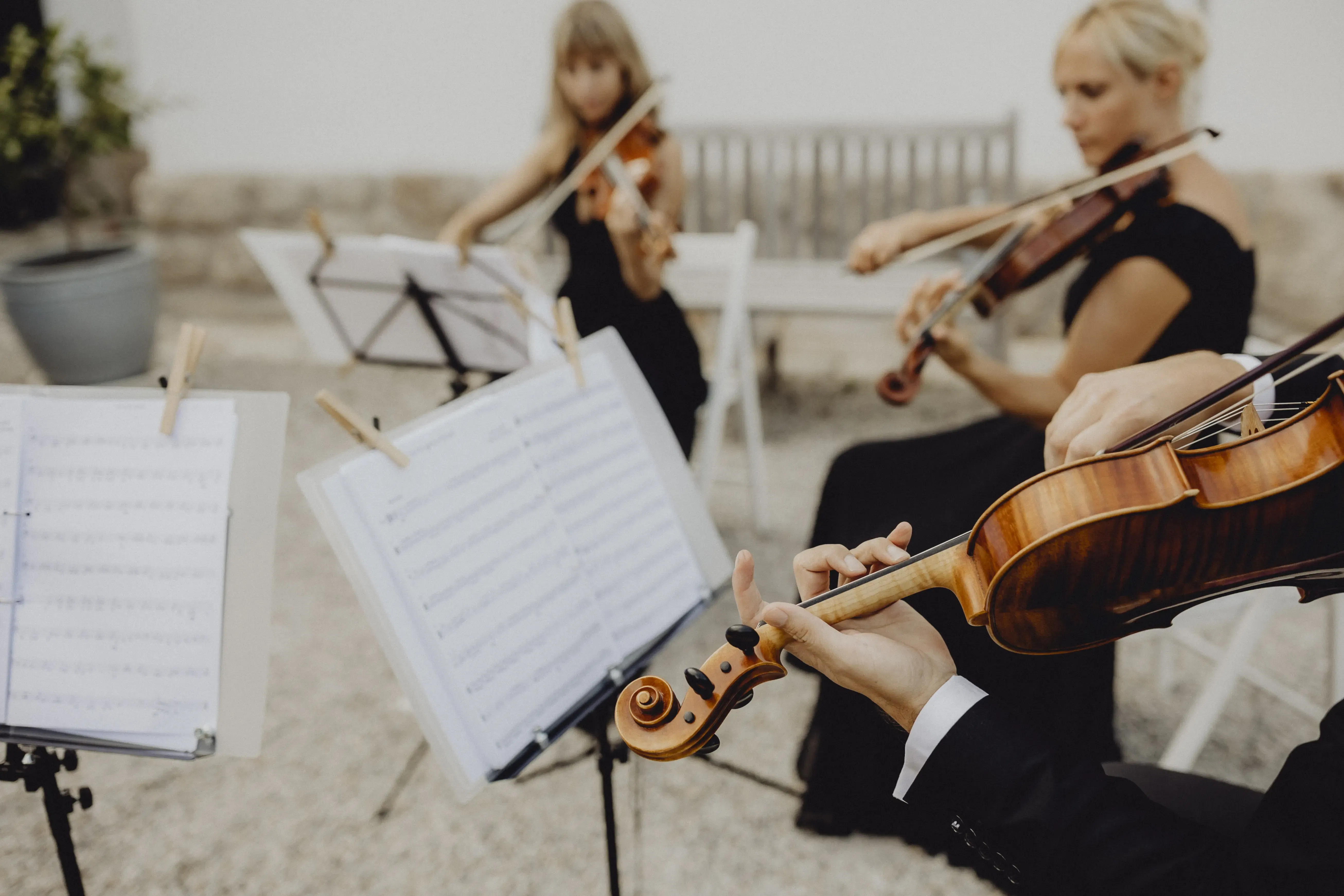 Einzigartig war dabei die Möglichkeit der katholischen Trauung im Rosengarten durch den Pfarrer des Paares. Für die musikalische Begleitung wurde das Streichquartett Art4Strings engagiert. Die Gruppe studierte extra Songs aus den Lieblingsfilmen des Paares ein. „Beim Einzug in den Rosengarten – zu dem Lied ‘Prinzessin Mononoke’ – war ich sehr nervös und versuchte angestrengt, nicht zu weinen“, erzählt die Braut. „Luisas Gesichtsausdruck beim Einzug wirkte eher streng und verunsicherte mich etwas. Ich dachte mir nur: Oje, was habe ich jetzt angestellt“, erzählt Martin schmunzelnd.