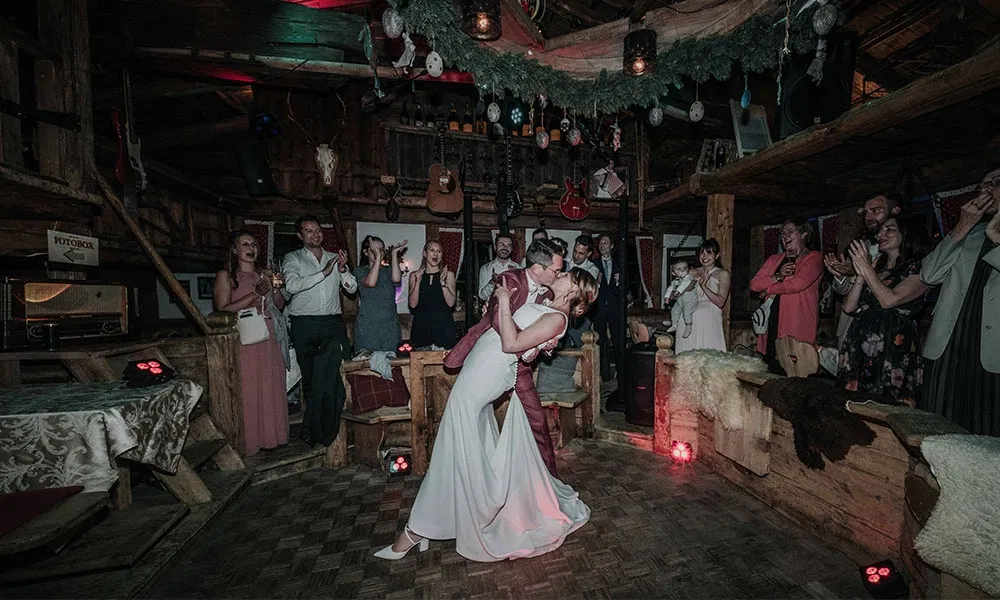 Ihr erster Tanz als Ehepaar wurde zu einem ganz besonderen Moment. Zu den sanften Klängen von „When You Say Nothing At All“ von Ronan Keating schwebten Jil und Steffen über den hölzernen Boden der Bergfried Alm – innig, natürlich und ganz sie selbst. „Tanzen war für uns tatsächlich eine kleine Herausforderung“, erzählt Jil lachend. „Wir hatten vorher nie wirklich zusammen getanzt und sind keine typischen Standardtänzer.“ Damit der Moment dennoch gelingt, bekam das Paar zur standesamtlichen Trauung einen Gutschein für Tanzstunden geschenkt – von Jils Patentanten. Zwischen der standesamtlichen Feier und der freien Trauung nutzten die beiden die Zeit für Privatstunden bei einem professionellen Tanzlehrer – einem Weltmeister im Discofox. „Er hat uns mit viel Geduld und Humor fit gemacht“, sagt Jil. Sie entschieden sich für einen langsamen Walzer, der ganz natürlich in einen beschwingten Discofox überging. „Das war der Startschuss für die Party.“
