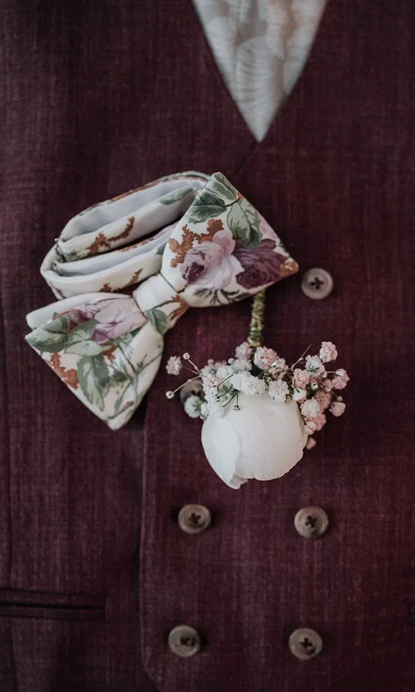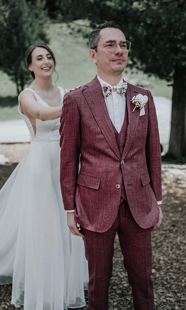 Steffens Hochzeitslook war das Ergebnis eines längeren, sorgfältigen Prozesses. „Ich habe meinen Anzug bei Rooks & Rocks in Berlin anfertigen lassen – komplett maßgeschneidert“, erzählt er. Gemeinsam mit seinem Trauzeugen war er mehrmals dort, um Stoff, Schnitt und Accessoires perfekt abzustimmen. Es ging um jedes Detail – vom Material über die Weste bis hin zur Frage: Fliege oder Krawatte? Am Ende fiel die Wahl auf einen dreiteiligen Anzug in einem warmen Rotton, der wunderbar mit der Bergkulisse und Jils modernem Kleid harmonierte. „Wir wollten etwas, das auffällt, aber trotzdem elegant bleibt – und die Farbe passte einfach perfekt.“ Dazu kombinierte Steffen eine passende Fliege, Weste und ein Einstecktuch, verzichtete bei sommerlichen Temperaturen aber auf Socken. „Ich trug Loafer – das war bequem, stilvoll und passte ideal zum entspannten Look unserer Feier in den Bergen.“