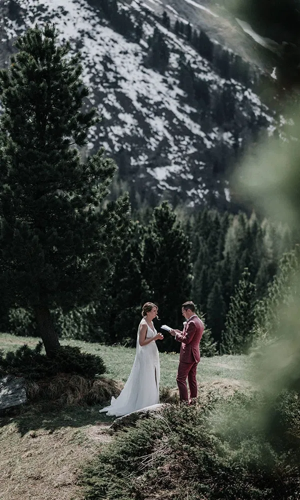 Neben der beeindruckenden Landschaft gab es noch einen Moment, der ihnen besonders im Herzen geblieben ist: ihr First Look. „Wir haben uns vor der Trauung an einem abgelegenen See getroffen, nur wir zwei“, erzählt Jil. „Dieser Moment, ihn dort zu sehen, ganz ohne Trubel, war unglaublich emotional.“ Dort, umgeben von den Bergen, tauschten sie auch ihre persönlichen Ehegelübde aus – ganz für sich allein. „Das war eine wunderbare Entscheidung“, sagt Steffen. „So konnten wir den Rest des Tages völlig entspannt mit unseren Gästen genießen, ohne Hektik, ohne Unterbrechungen.“