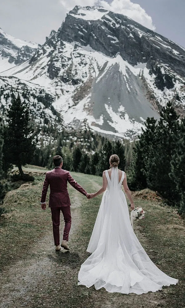 Für Jil war die Suche nach ihrem Brautkleid überraschend unkompliziert. „Ich war bei Marry Me in Dötlingen, einem Geschäft ganz in der Nähe unseres Wohnorts“, erzählt sie. „Ich wusste ziemlich genau, was ich wollte – ein cleanes, schlichtes Kleid ohne viel Spitze oder Schnörkel.“ Schon beim vierten Kleid war klar: Das ist es. „Es war figurbetont, mit feinen Trägern, einer eleganten Knopfleiste am Rücken und einer abnehmbaren Schleppe“, beschreibt Jil. Ein besonderes Detail war der Überrock aus leichtem, transparentem Stoff, der dem Look beim Einzug eine festliche Note verlieh und später für die Party einfach abgenommen werden konnte. „So konnte ich mich ganz frei bewegen – perfekt für unseren Tag in den Bergen.“