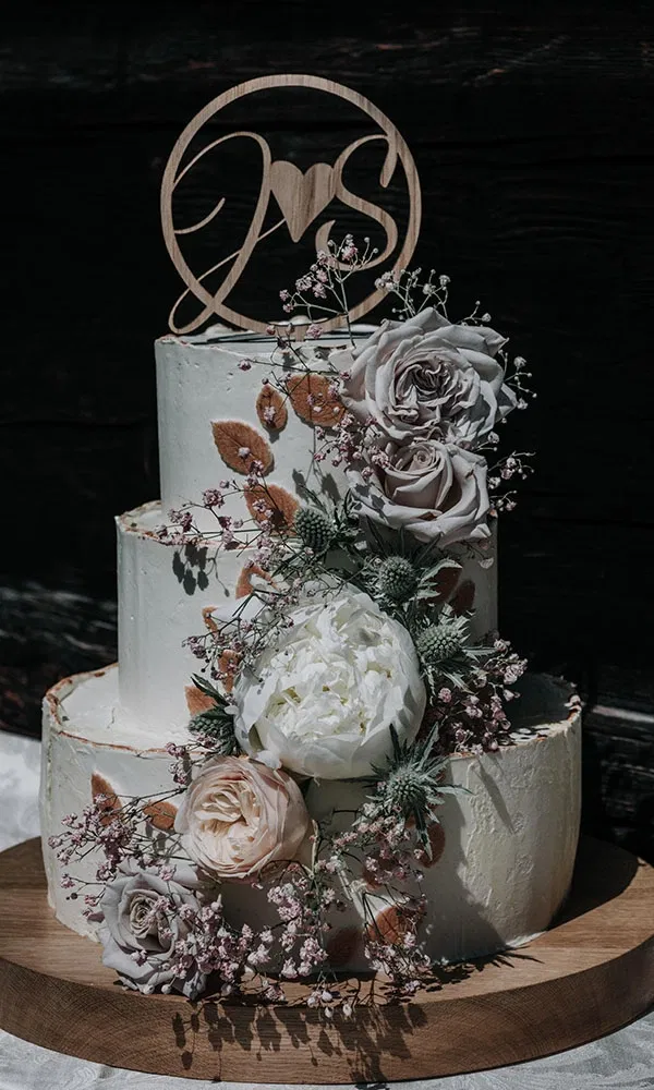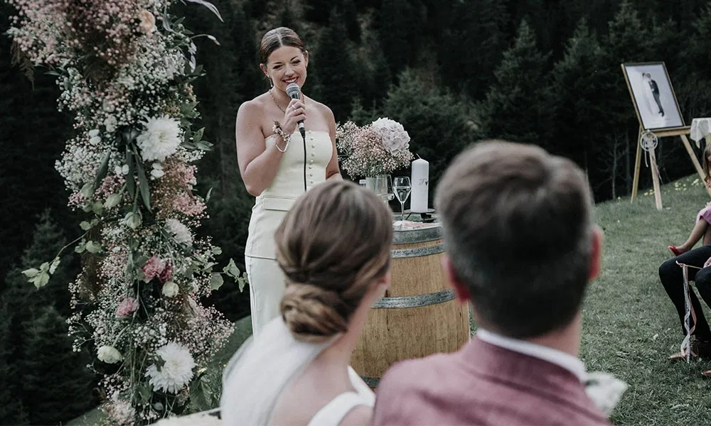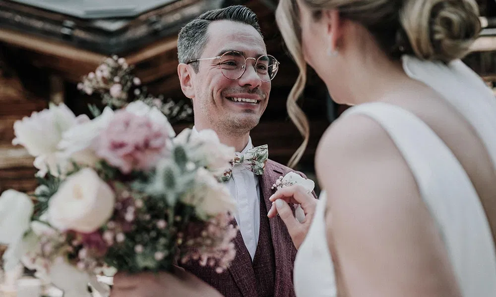Die Blumenarrangements stammten von der Haus-Floristin des Hotels Bergfried, die das Paar auf Empfehlung der Gastgeberin engagierte. „Uns war wichtig, dass die Blumen zu den Bergen und zum Mai passen“, erzählt Jil. Im Mittelpunkt standen Pfingstrose kombiniert mit Blush- und Rosatönen sowie zarten Akzenten in kräftigerem Pink. „Die Farbpalette harmonierte wunderbar mit der natürlichen Umgebung der Alm“, sagt Steffen. Der Traubogen auf 1.800 Metern wurde üppig geschmückt, dazu kamen ein passender Brautstrauß, Anstecker für Steffen und den Trauzeugen sowie Blumenarmbänder für Trauzeugin und Rednerin. Selbst die Kinder bekamen kleine Blumendetails: Haarkränze und Mini-Anstecker.