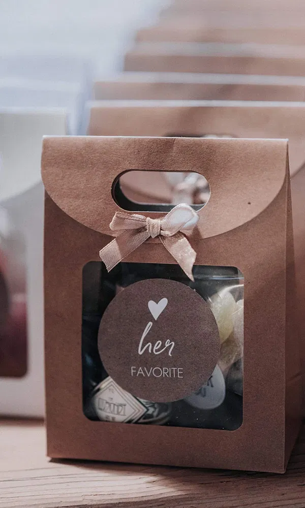 Bei ihrer Feier legten Jil und Steffen großen Wert darauf, persönliche Akzente zu setzen – und entschieden sich für mehrere Do-it-yourself-Elemente. Besonders viel Herzblut steckte im Thema Gastgeschenke. „Das war tatsächlich einer der Punkte, über den wir am längsten diskutiert haben“, erinnert sich Jil lachend. „Wir wollten etwas, das uns wirklich repräsentiert.“ Da beide Gin-Liebhaber sind – allerdings mit unterschiedlichen Favoriten –, entstand die Idee für drei kleine Geschenkvarianten: „For His“, „For Hers“ und „For Ours“. In der Tüte „For His“ befand sich Steffens Lieblingsgin GINSTR in einer Mini-Flasche, kombiniert mit seiner Lieblingssüßigkeit, den Manner-Schokowaffeln. Die „For Hers“-Version enthielt Jils Lieblingsgin Illusionist und saure Zungen – ihre persönliche Lieblingsnascherei. Und in der Variante „For Ours“ steckte ein gemeinsamer Favorit: kleine Pringles-Dosen. „Die Gäste konnten sich aussuchen, welche Tüte sie mitnehmen wollten“, erzählt Jil. „Einige haben sogar zwei gewählt – das war völlig in Ordnung.“