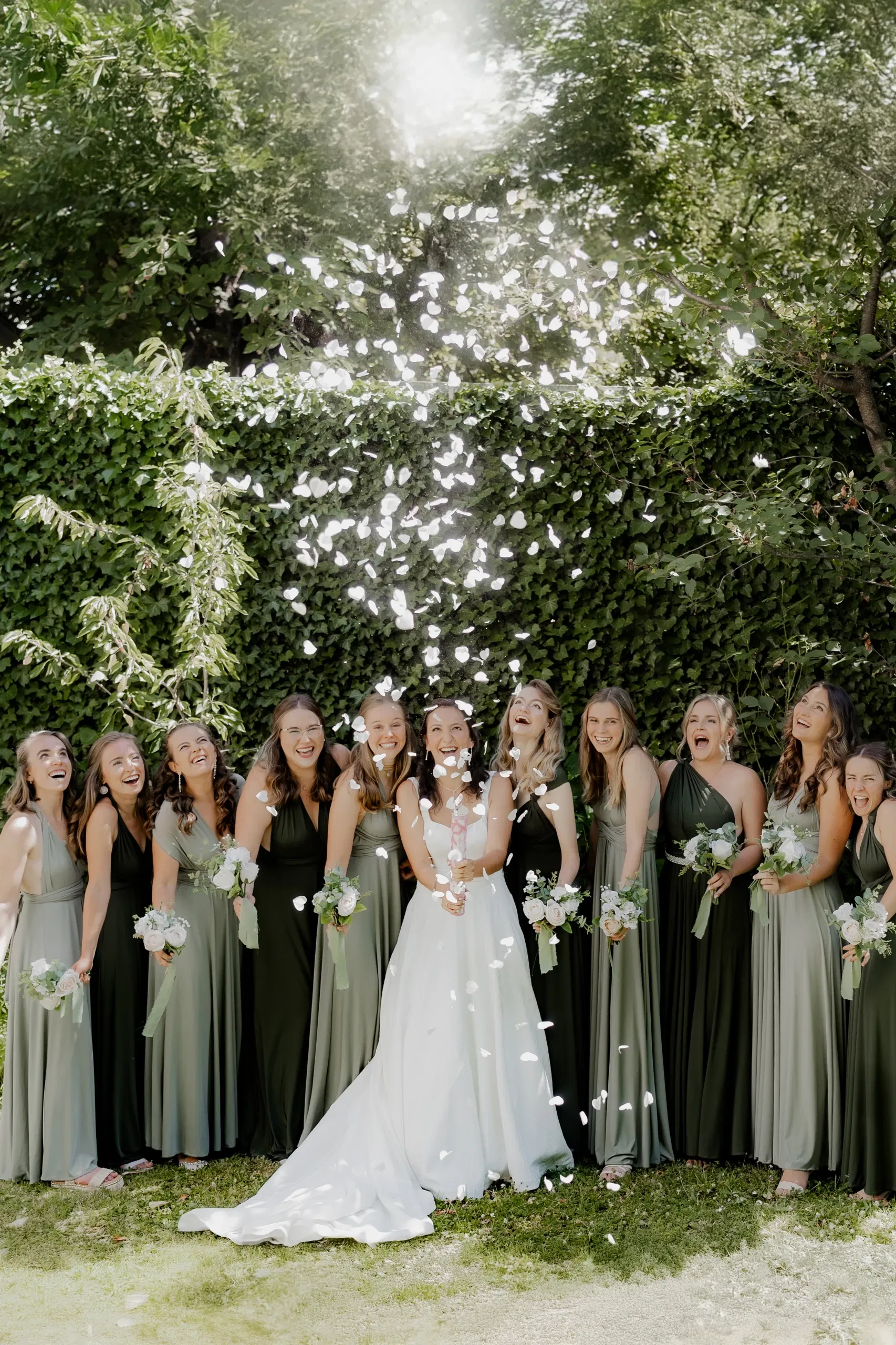 Mit viel Liebe zum Detail wählte Leni auch die Farbe, die sich durch die gesamte Hochzeit zog: Salbeigrün. Wichtig war ihr, dass auch alle zehn Brautjungfern passende Kleider zum Farbkonzept trugen, denn immerhin spielen sie in ihrem Leben als Freundinnen und Wegbegleiterinnen eine zentrale Rolle.