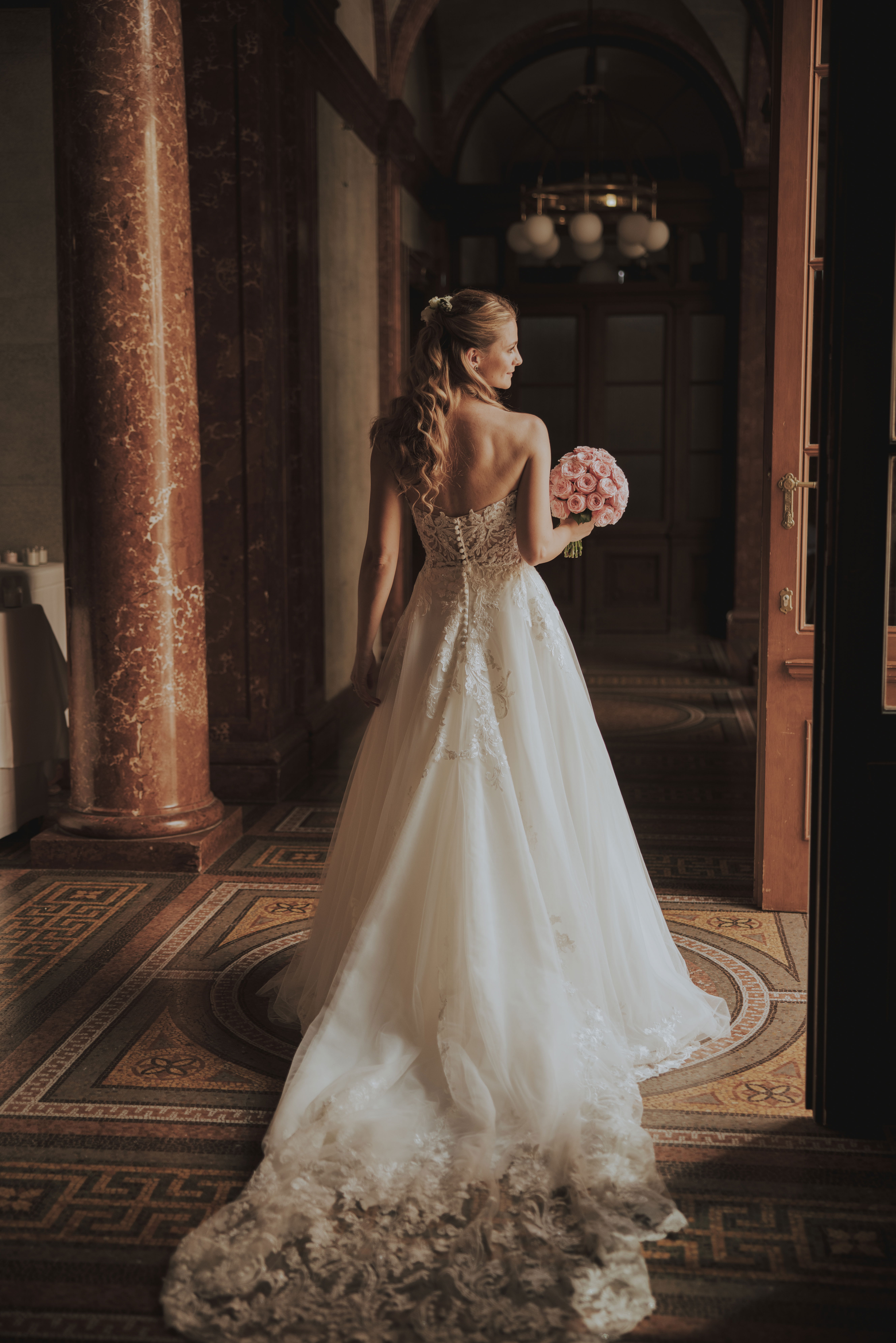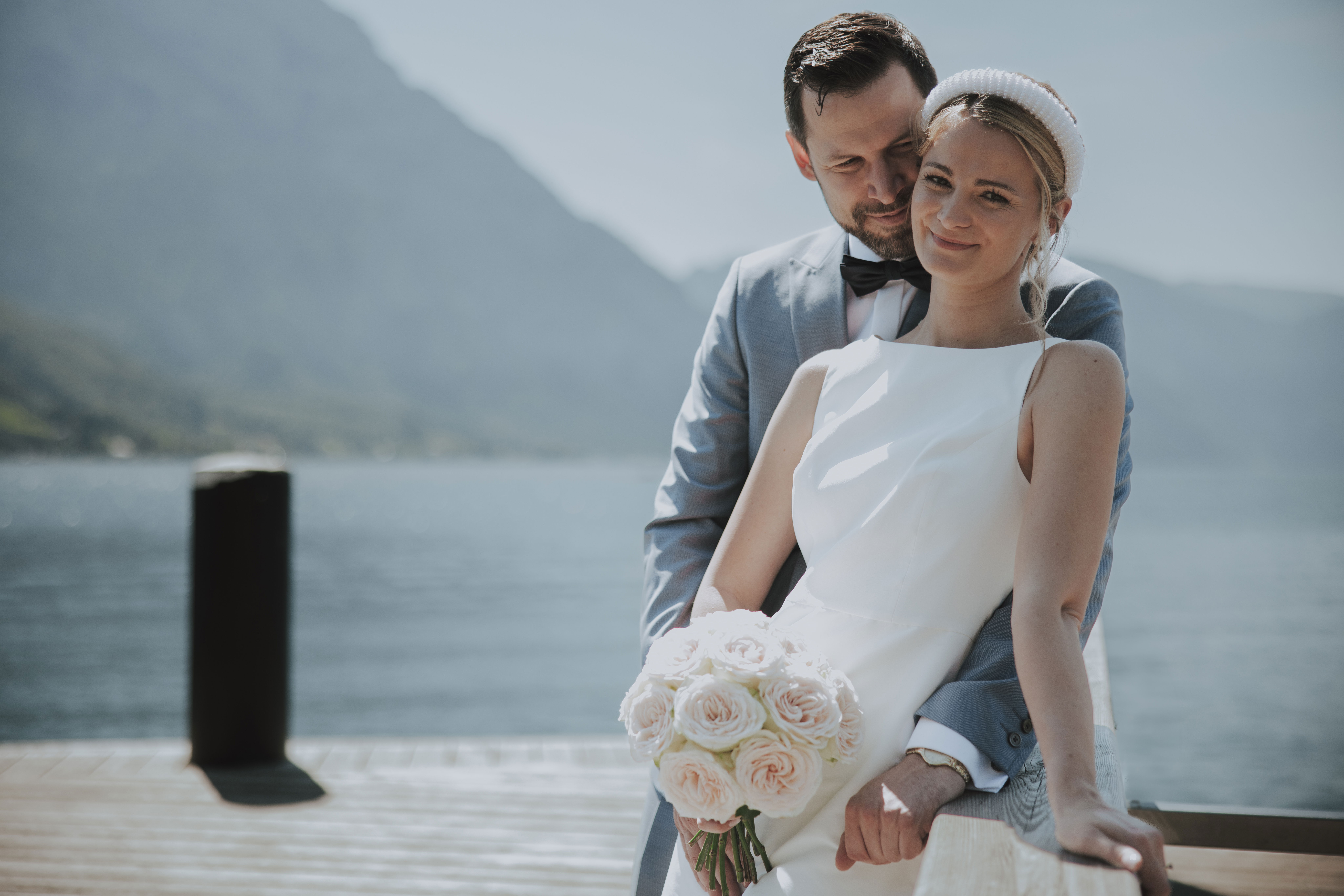 Während sich die Hochzeitsplanerin in Absprache mit dem Brautpaar um die Details kümmerte, musste sich Nicola beeilen, um noch rechtzeitig ein passendes Brautkleid zu finden. In einem Brautgeschäft in London entdeckte sie schließlich ihr Traumkleid von Pronovias in Form einer zarten A-Linie. Für die standesamtliche Trauung, die mittags am Tag vor der Freien Trauung im Seeschloss Ort stattfand, entschied sich Nicola für ein kurzes weißes Kleid mit elegantem Haarreif – ein Geschenk ihrer Freundinnen. Bei einer abendlichen Schifffahrt über den Traunsee feierte das Brautpaar bereits zusammen mit einigen Familienmitgliedern und Freunden das standesamtliche Ja und stimmte sich bestens gelaunt auf den großen Tag ein.