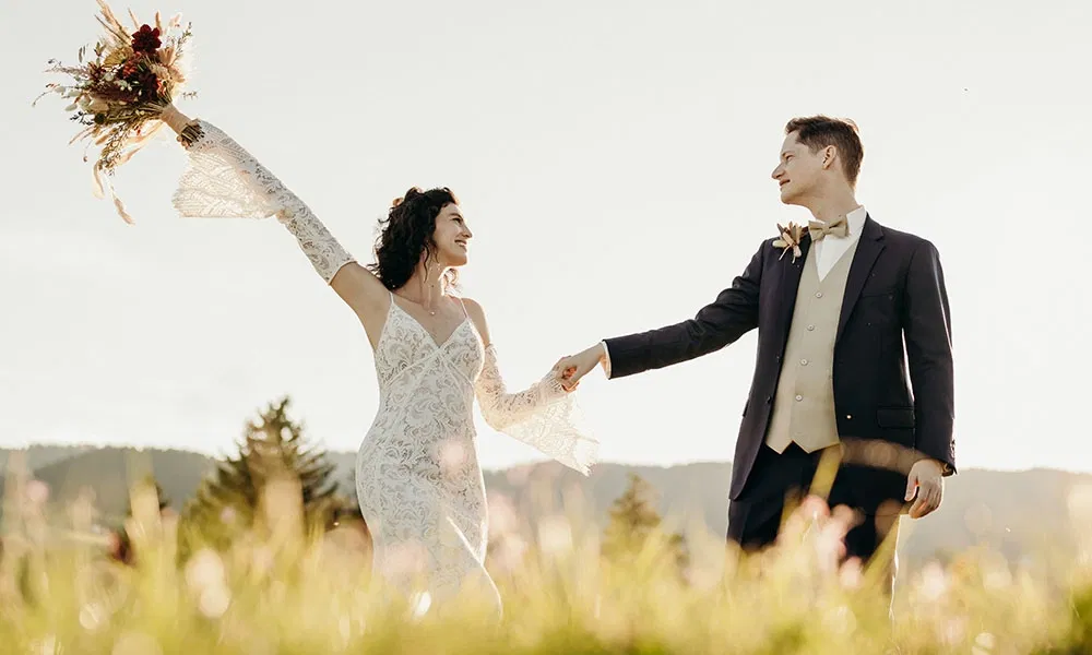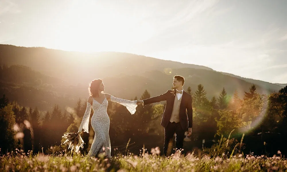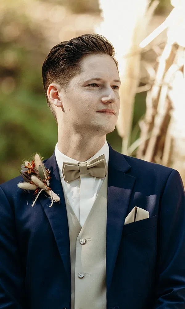 Auch Christophs Outfit fand seinen Weg mit Unterstützung: „Ich habe meinem Trauzeugen die Aufgabe gegeben, ein paar Herrenausstatter in Wien herauszusuchen“, erzählt er. „Er hatte drei oder vier auf der Liste und ich war dann schließlich bei zwei davon. Bei einem habe ich mich sofort wohlgefühlt – die Beratung war einfach top.“ Die Entscheidung fiel auf einen klassischen Anzug in Navyblau, kombiniert mit einer beigen Weste und Fliege. „Über die Accessoires wollten wir trotzdem den Boho-Vibe aufgreifen“, erzählt Christoph. Melanie ergänzt: „Christoph hatte einen kleinen Anstecker aus Trockenblumen in Beige- und Rosttönen, passend zu meinem Brautstrauß.“