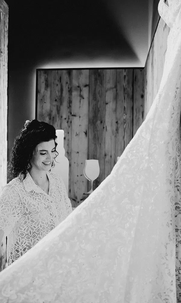 Melanies Boho-Brautkleid war ein echter Glücksgriff – wenn auch keiner auf den ersten Blick. „Ich war im März mit meiner Mama und zwei Freundinnen auf der Suche“, erzählt sie. „In der ersten Boutique fand ich ein Kleid, das mir unglaublich gut gefallen hat – ein Einzelstück aus der Vorjahreskollektion.“ Weil es jedoch ihr allererster Termin war, wollte Melanie sich noch umsehen. „Ich dachte mir, ich sollte noch vergleichen – aber als ich zurückkam, war das Kleid schon verkauft. Ich war total enttäuscht.“ Bei einem weiteren Termin in der Boutique Bespoke Bridal kam dann alles anders. „Die Beraterin meinte, ich solle dieses eine Kleid doch einmal anprobieren. Ich war skeptisch – ich war mir sicher, das steht mir nicht.“ Und dann passierte es: „Es hat perfekt gepasst – figurbetont, aus zarter Spitze, mit einer eleganten Schleppe. Genau das, was ich mir eigentlich gewünscht hatte.“ In den letzten Minuten des Termins fiel die Entscheidung – spontan, aber goldrichtig. „Im Nachhinein war es einfach das perfekte Kleid.“ Ein besonderes Detail: Die abnehmbaren Ärmel sorgten für einen wandelbaren Look zwischen Trauung und Feier – romantisch, modern und ganz im Boho-Stil der gesamten Hochzeit.