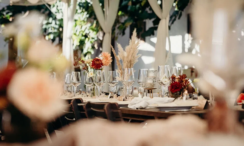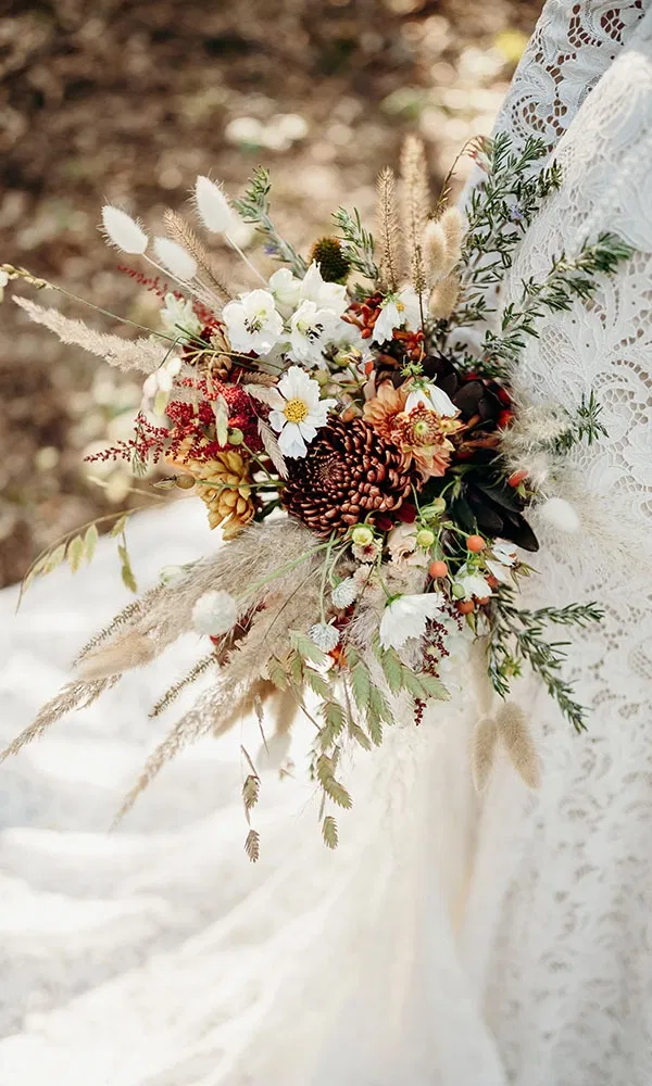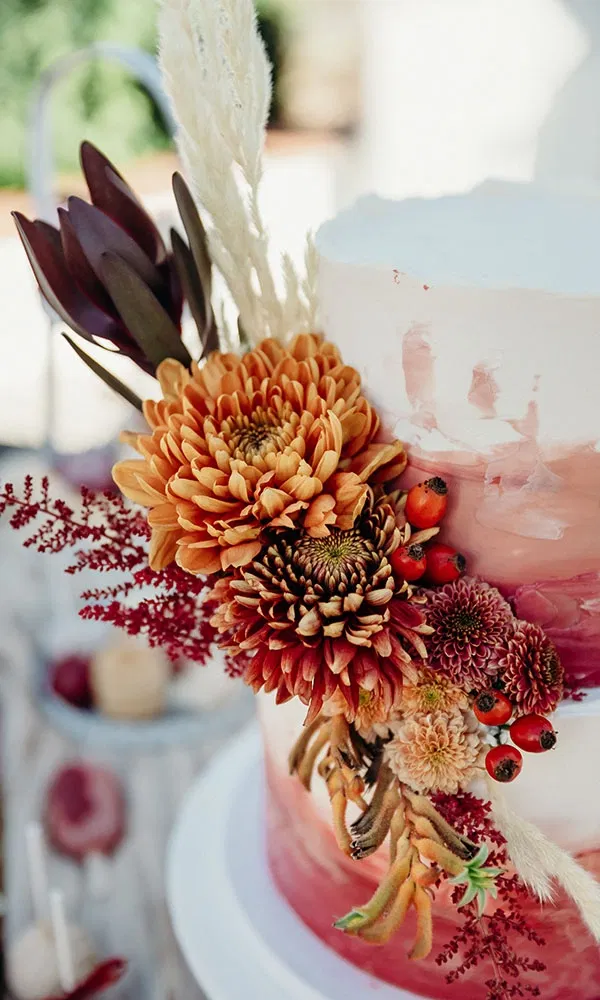 Der Traubogen war bereits Teil der Location – eine geschwungene Konstruktion aus Weide, die sich wunderbar in die natürliche Umgebung einfügte. „Diesen Bogen konnte man individuell schmücken lassen“, erzählt Melanie. „Unser Blumenthema war herbstlich, in warmen Creme-, Terrakotta-, Dunkelrot- und Lachstönen, kombiniert mit Trockengras. Ein echter Boho-Traum.“ Die Floristin setzte das Konzept bis ins Detail um: Vom Traubogen über die Tische bei der Agape bis hin zur festlichen Tafel zog sich der Stil wie ein roter Faden durch das gesamte Setting. Selbst die Hochzeitstorte wurde mit Blumen in denselben Farben verzier: ein stimmiges, liebevoll gestaltetes Gesamtkonzept.