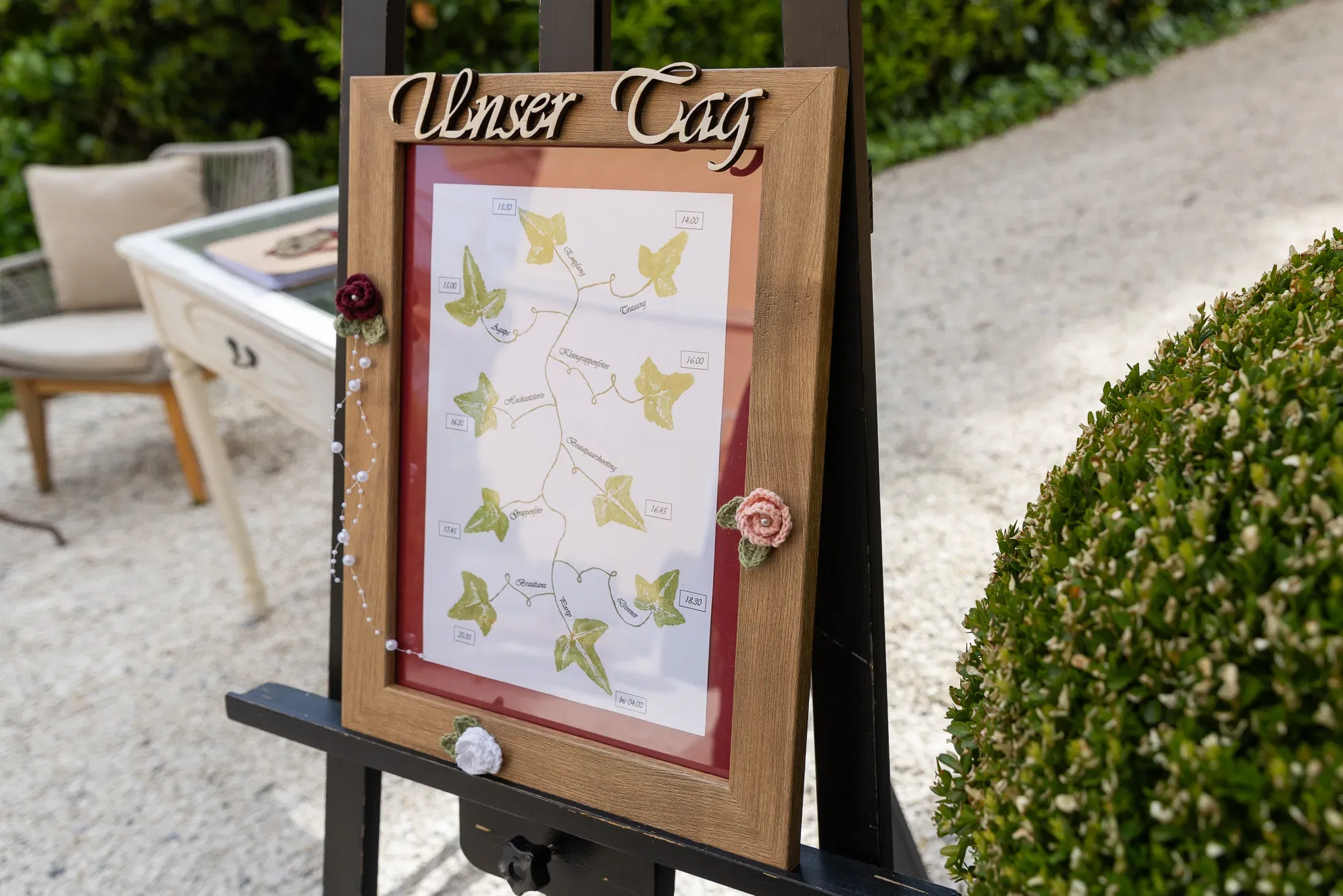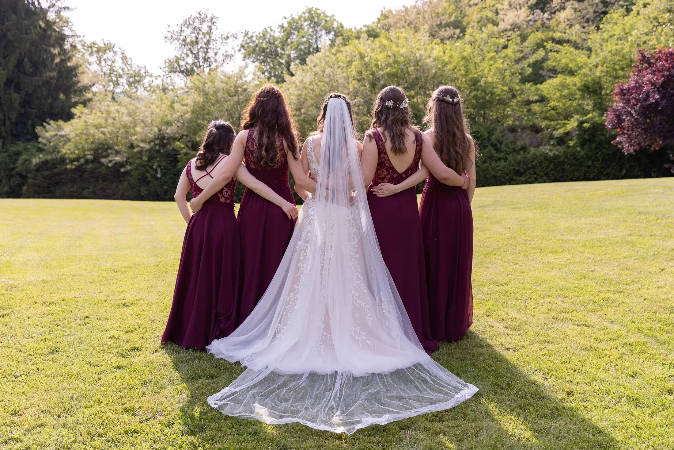Wie ein roter Faden zogen sich dann am Hochzeitstag die Farben Bordeauxrot, Lachs, Weiß und Grün durch den Hochzeitstag. Ebenfalls überall zu sehen, egal, ob auf dem Menüplan, dem Blumenschmuck oder der Tischdekoration: Melissas Lieblingsblumen, Rosen, und der Efeu, der für die beiden für Treue und Beständigkeit steht. Auch Melissas Haarschmuck aus echten Blumen passte genau in das Konzept. Bordeauxrot waren dann auch die Kleider von den vier Brautjungfern und die Drinks, die das Aiola extra für die Hochzeit der beiden konzipierte und zur Agape und den Gratulationen reichte.