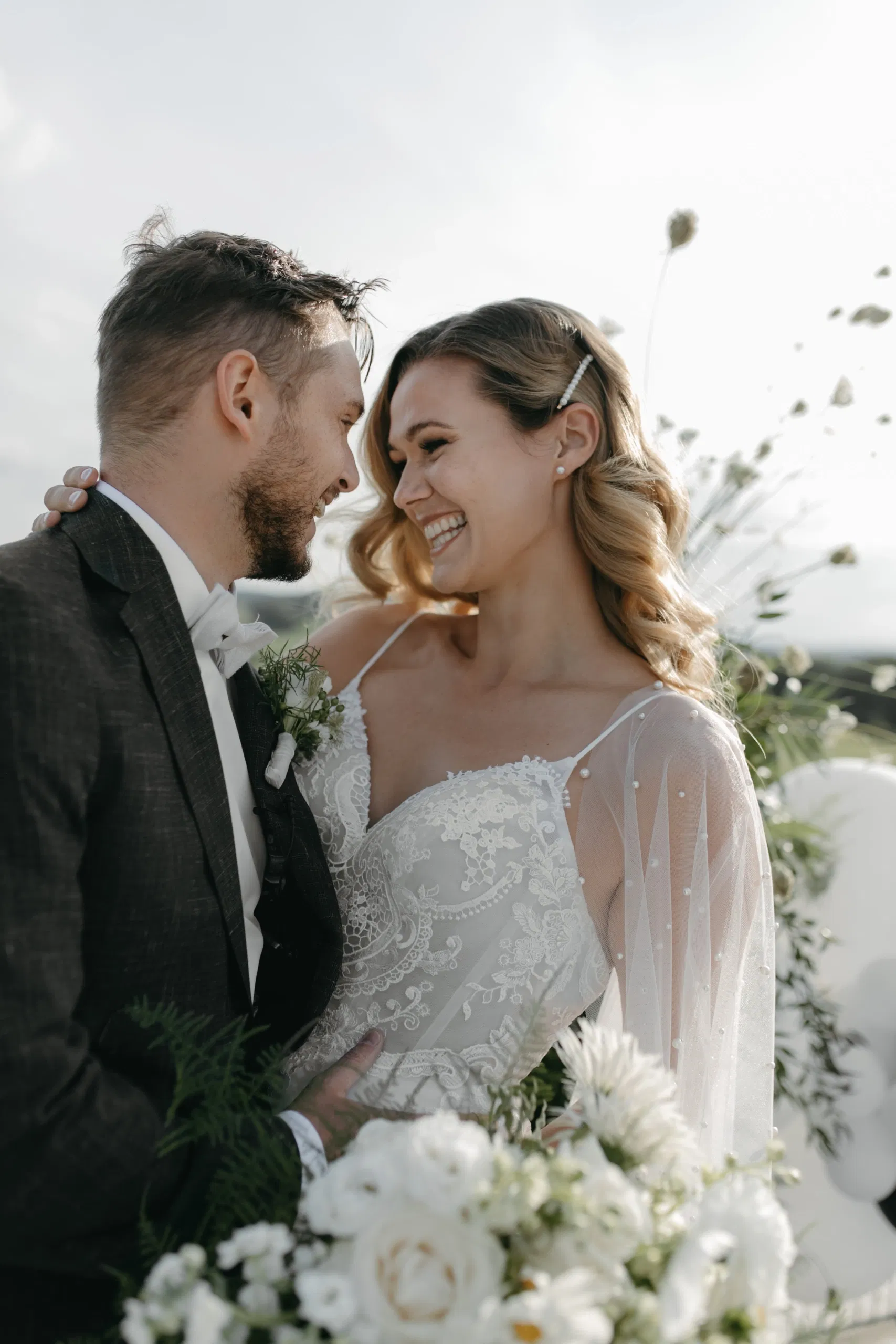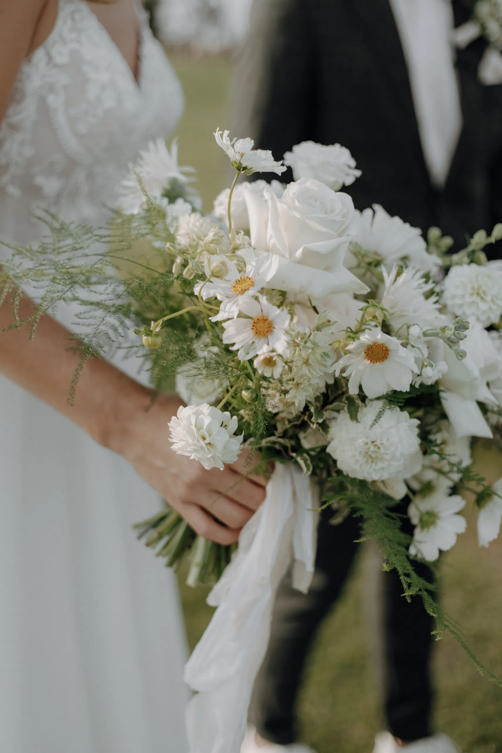 Weiße Rosen sehen immer edel aus und zusammen mit weißen, fluffigen Wildblumen wird daraus ein bezauberndes Blumen-Arrangement. Nicht nur für den Brautstrauß, sondern auch für die Dekoration des Trau-Ortes, der Feier-Location und auf der Festtafel.