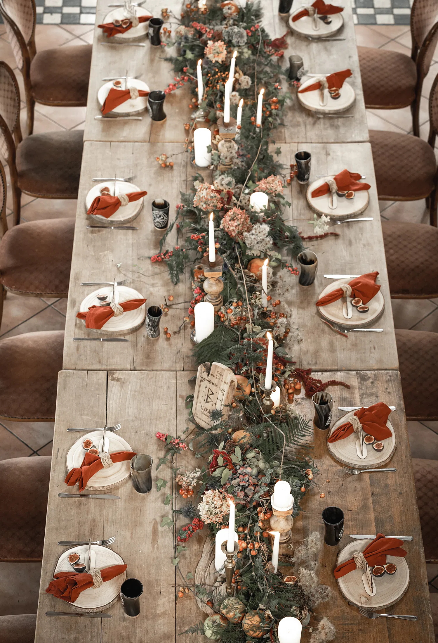 Die Dekoration einer Wikinger Hochzeit ist warm, erdig und detailverliebt. Lasst massive Holztische wirken und ergänzt sie mit schlichten Leinenläufern. Zieht üppige Girlanden aus Tannengrün, Beeren, getrockneten Blüten und saisonalen Früchten über die gesamte Tischlänge.