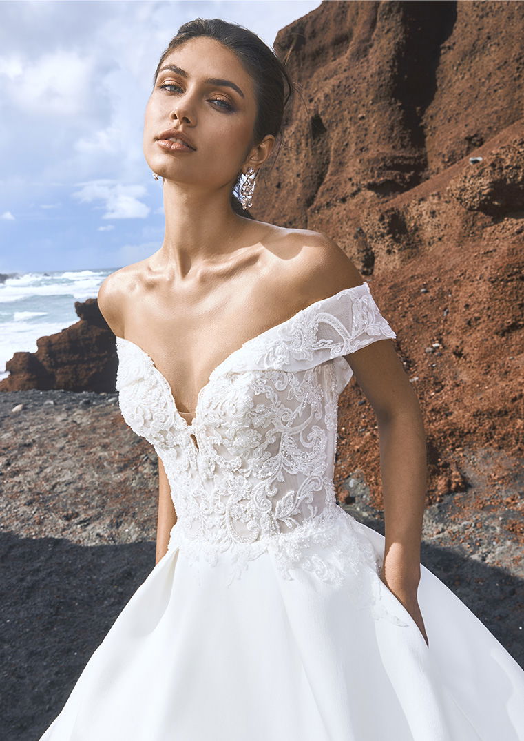 Die Basis des romantischen und luxuriösen Sissi-Looks ist ein üppiger Rock in der sogenannten Duchesse-Linie. Für eine schmale Taille ganz im Stil der schönen Kaiserin sorgen geschnürte Mieder, die an Sissis Korsetts erinnern. Dazu ein eleganter Carmen-Ausschnitt, der Schultern und Dekolleté der Braut stilvoll in Szene setzt. Schicke Verzierungen aus Perlen, Kristallen oder schimmernden Fäden verleihen den Sissi-Brautkleidern das gewisse Etwas.