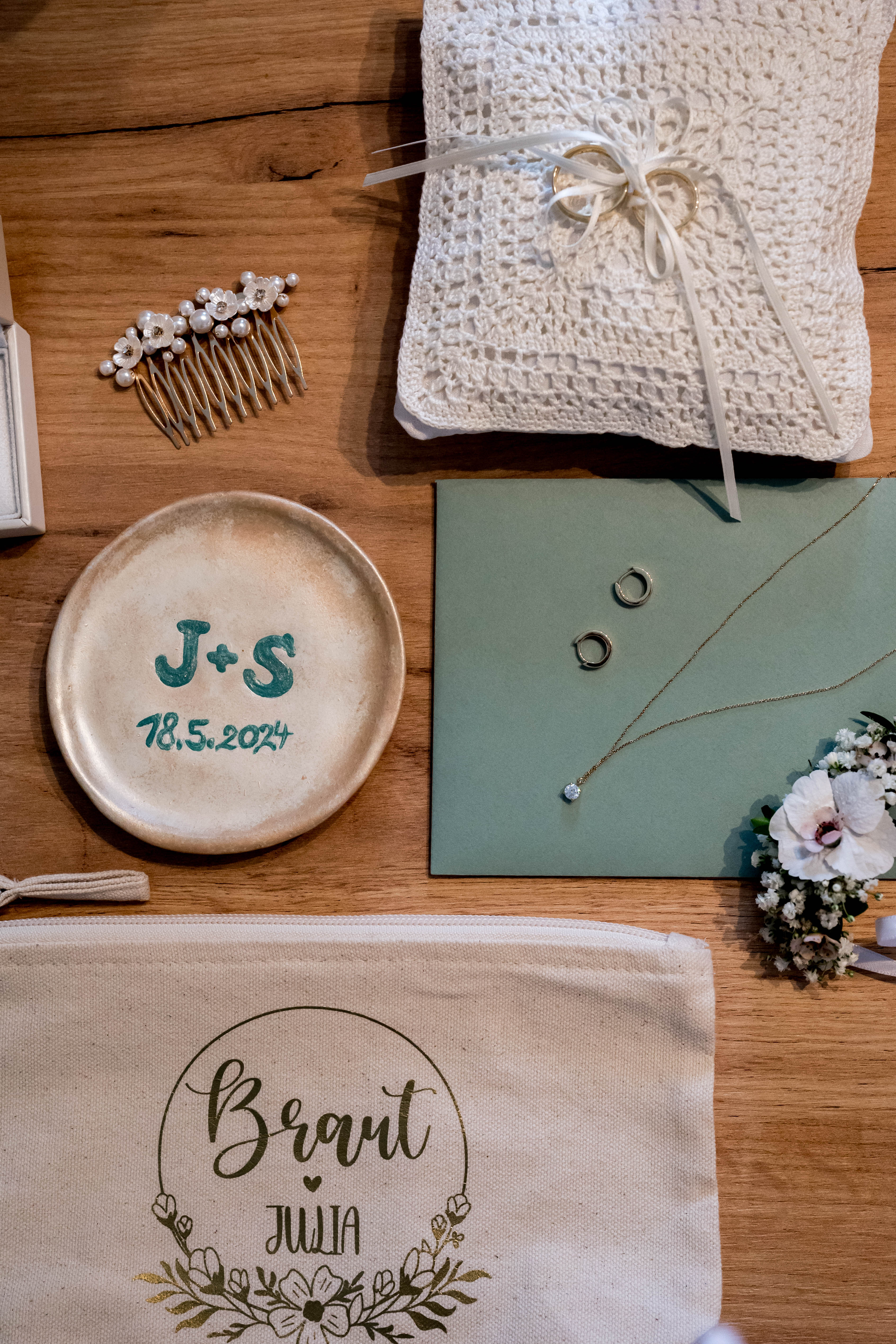 Ringkissen: Wie eng die Beziehung zu ihren Familien ist, beweist die Tatsache, dass Julias Schwester nicht nur extra ein Ringkissen anfertigte, sondern auch eine Ringschale mit den Initialen des Brautpaars sowie dem Hochzeitsdatum töpferte.