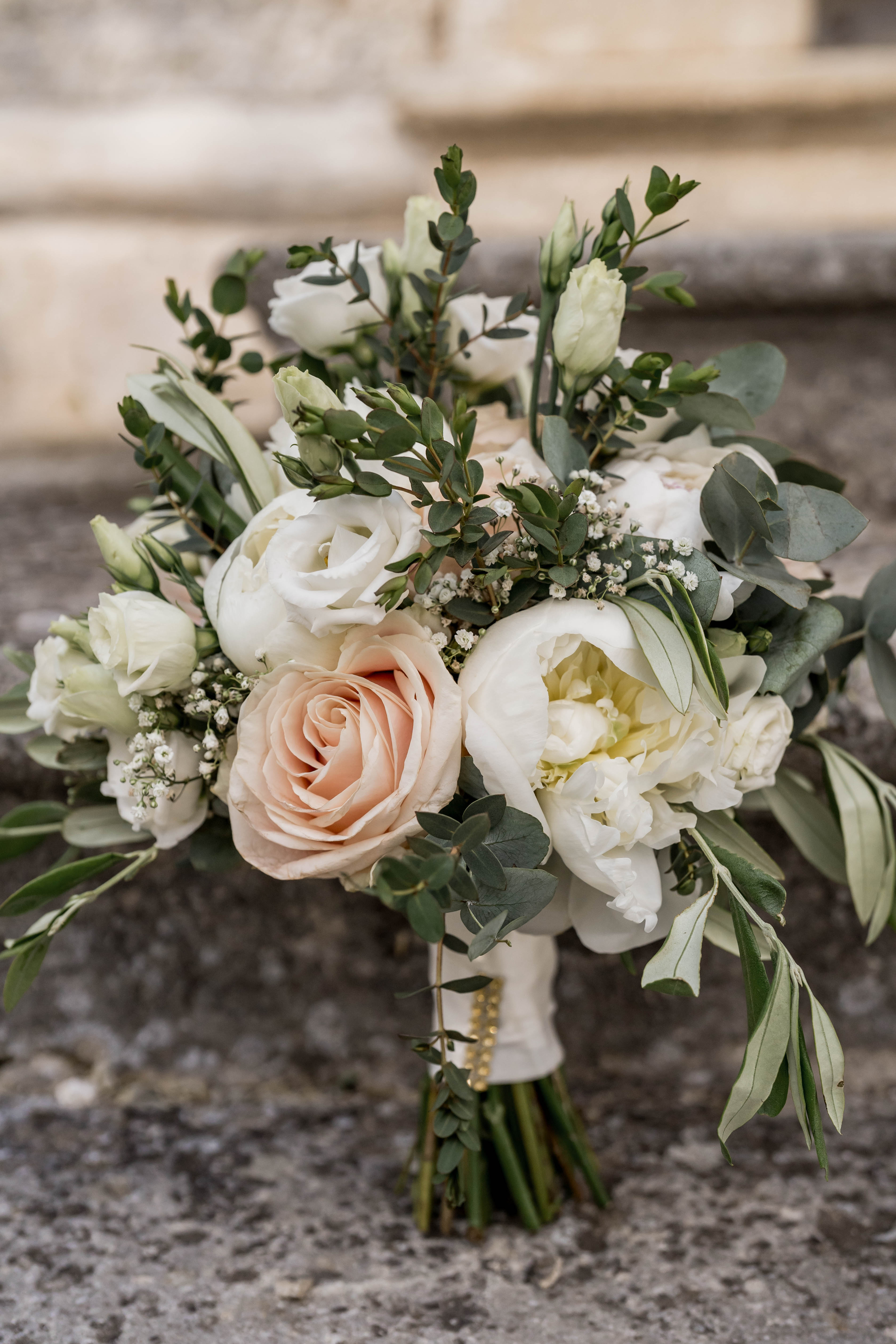 Brautstrauß: Der gesamte Blumenschmuck inklusive Brautstrauß, bestehend aus Pfingstrosen, Rosen, Lisianthus, Schleierkraut und Eukalyptus, stammte von Floristik Claudia Holzer aus Etsdorf. www.floristik-holzer.at