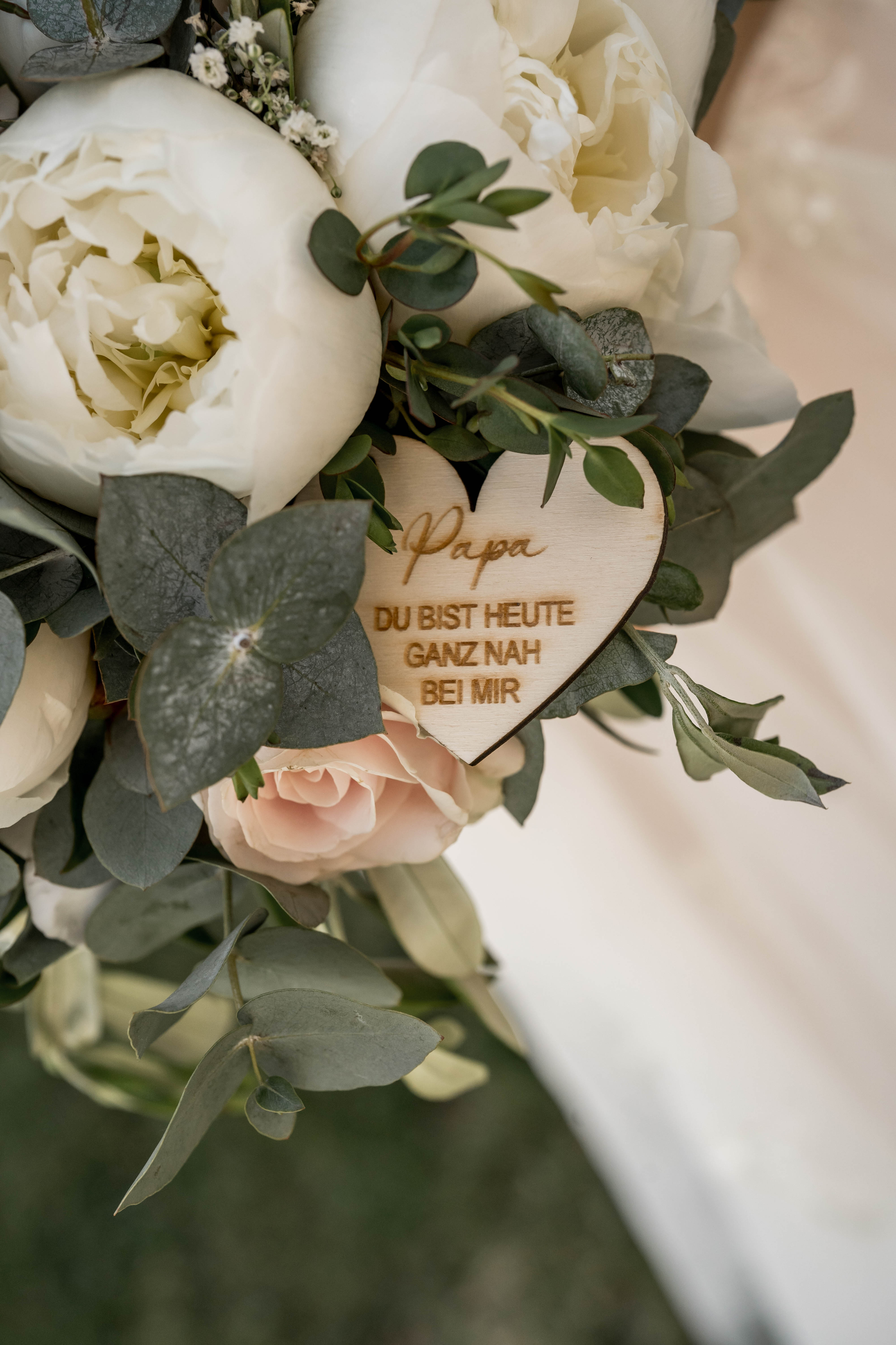 Ihr Vater konnte leider nicht mehr dabei sein. „Mein Papa ist 2014 gestorben, deshalb hatte ich einen Herzanhänger aus Holz an meinem Brautstrauß mit den Worten Papa du bist heute ganz nah bei mir.“ So emotional die Trauung begonnen hatte, so gefühlvoll ging es auch weiter. Der jüngere Neffe Christian wollte dem Brautpaar ebenfalls eine Freude machen und las während der Trauung eine Geschichte vor, die beide sehr berührte. Musikalisch wurde die Zeremonie von Bernadette von „Stimme & Klavier“ begleitet. „Die Performance war der absolute Hammer und hat sowohl uns als auch die Gäste restlos begeistert“, sind sich Julia und Sascha einig.