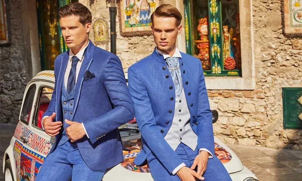 Diese beiden Hochzeitsanzüge präsentiert der italienische Hersteller Guglielmo. Links ein eleganter Anzug in kräftigem Königsblau mit klassischem Revers, kombiniert mit einer zweireihigen Weste im gleichen Farbton und einem dunkel gemusterten Einstecktuch. Rechts ein extravaganter Hochzeitsanzug im gleichen Blauton, jedoch in einer festlicheren Ausführung: Das Sakko ist im Stehkragen-Stil mit markanten schwarzen Knöpfen designt. Der Bräutigam trägt statt Fliege oder Krawatte ein elegantes Plastron.