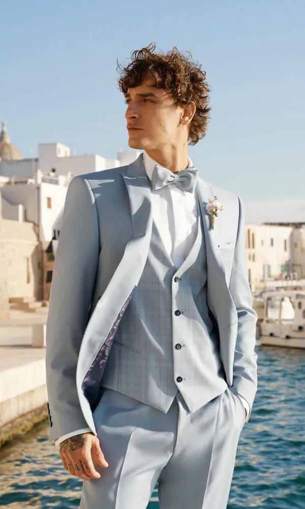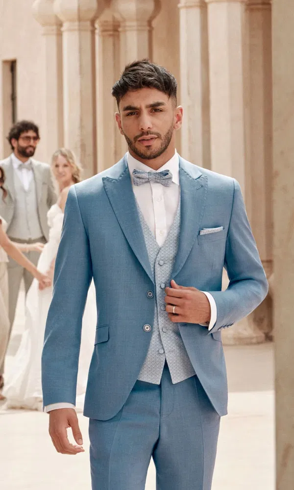 Der Bräutigam trägt einen eleganten Dreiteiler in einem strahlenden Blauton, der durch seine klare Linienführung und hochwertige Verarbeitung besticht. Das tailliert geschnittene Sakko mit schmalem Revers wird durch eine dezente Weste und eine perfekt abgestimmte Hose ergänzt. Dieser Look wirkt souverän, modern und ist sowohl für eine festliche Hochzeit im Ballsaal als auch für eine elegante Outdoor-Zeremonie bestens geeignet.