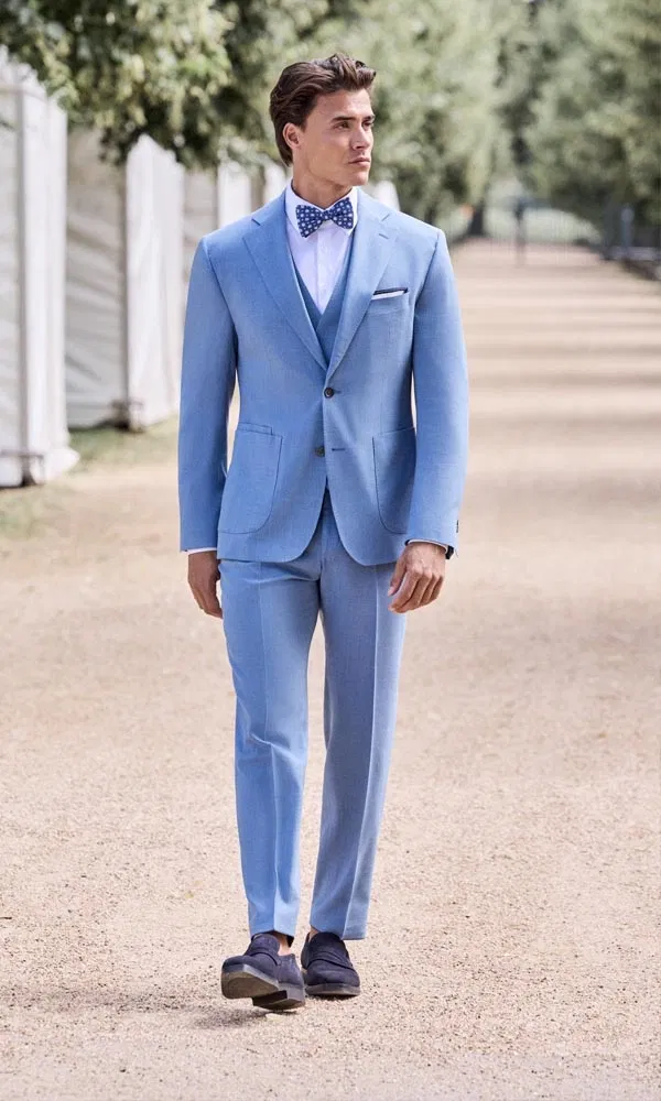 Wilvorst setzt in seiner Kollektion 2026 auf ein gedecktes Azurblau. Das schmal geschnittene Sakko wird mit silberfarbenen Knöpfen geschlossen. Die dezent gemusterte Weste in einem helleren Aquaton sowie das Einstecktuch verleihen dem Look Eleganz und Raffinesse. We love!