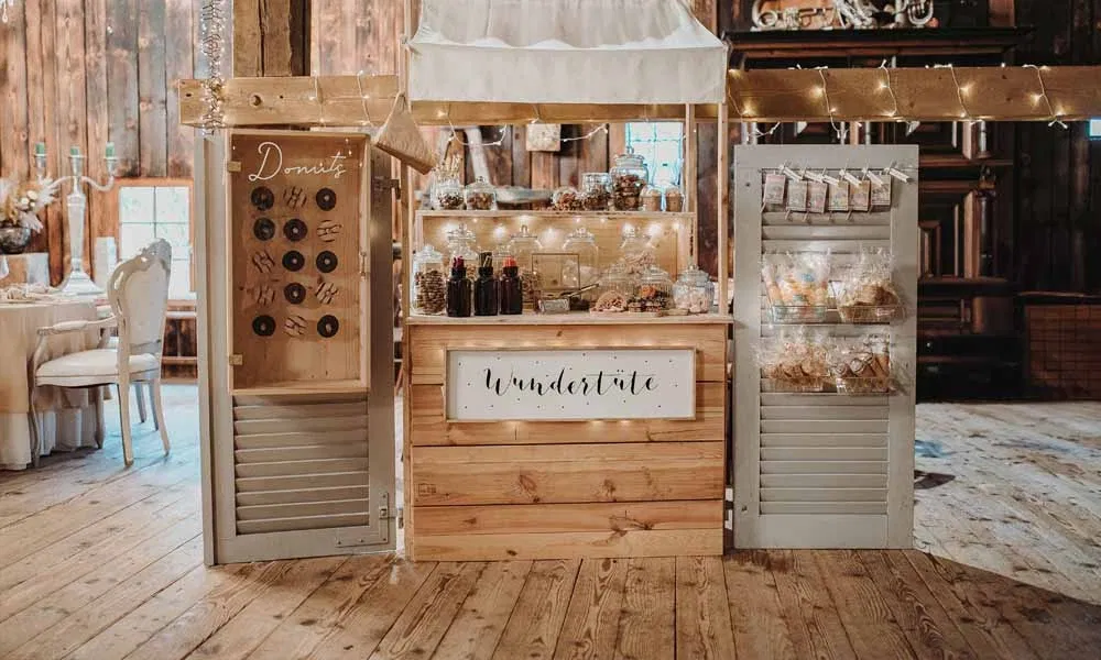 Glasgefäße, beschriftete Etiketten, Lichterketten und kleine Tütchen geben eurem Sweet Table Struktur und Stil. Besonders harmonisch wirkt es, wenn sich das Farbkonzept eurer Hochzeit im Sweet Table widerspiegelt. Ein liebevoll gestaltetes Schild mit einem süßen Spruch wie „Nasch dich glücklich“ macht die Candy Bar zum sympathischen Hingucker.